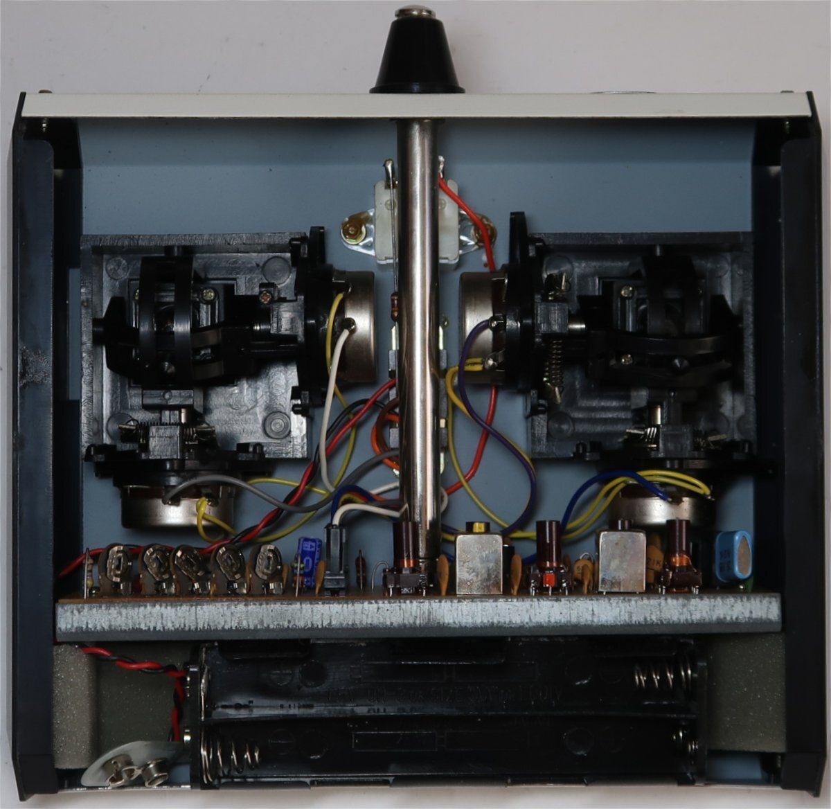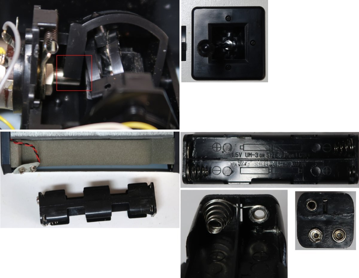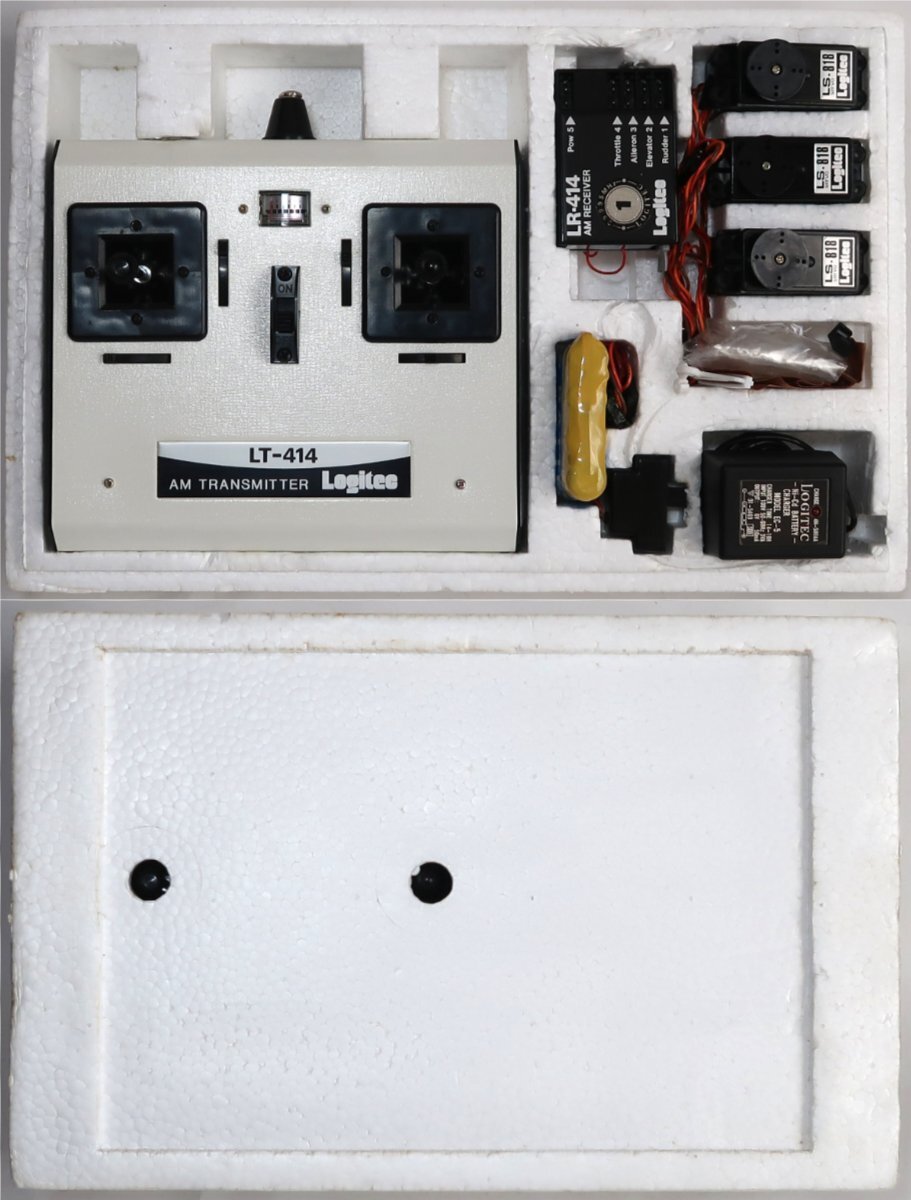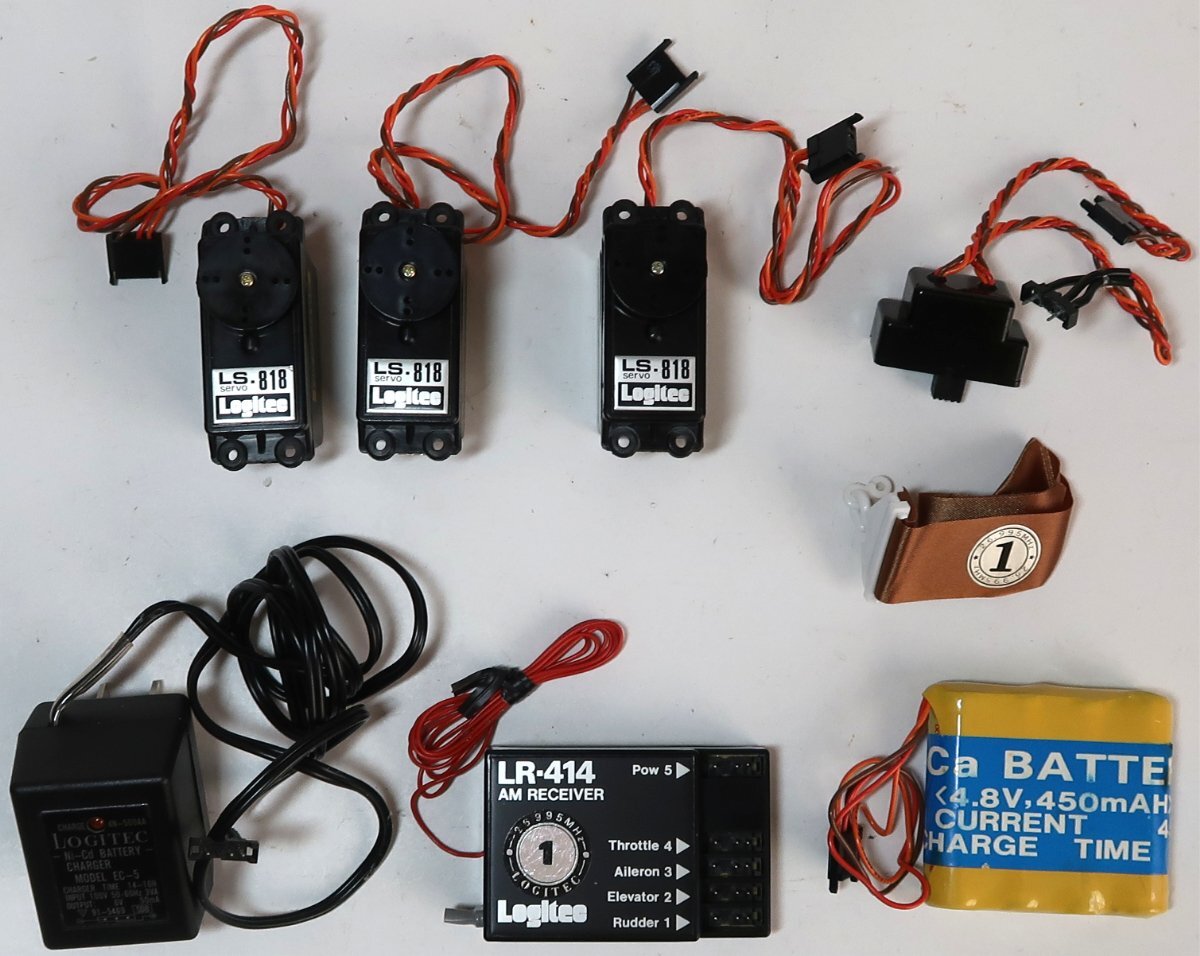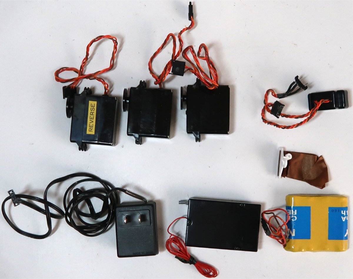出品は画像の物が全てです。説明書は折れていたり多少の汚れはあります。プロポや機器は使用品ですので多少の汚れや擦れは有ります。右スティックを左に傾けた時に自動で中央に戻らず左に傾いたままになります。中を調べるとプラスチックパーツが劣化した為か折れてプロポの中にありました。四角(赤色)で囲ってある箇所です。折れたパーツは画像に載せております。このままだと操作に支障があるので、この部分はご自分で補修するしかないです。プロポの電池ケースが割れていたので、瞬間接着剤で接着しました。電池を入れてまた破損する可能性があります。プロポ用電池ケースの補修する前に電池を入れて、破損箇所はゴムバンドで止めてプロポに接続しました。バッテリーの張りが動作したので、プロポの方の通電はしております。受信機用のバッテリーは充電できませんでした。おそらく消耗し切っている感じです。この受信機のコネクターは専用のものなので他メーカーの電池ケースを接続して受信機及びサーボの動作テストは出来ておりません。分かることは以上です。このような状態ですのでお取引後はいかなる理由がありましても返品はできませんしクレームはお受けできません。