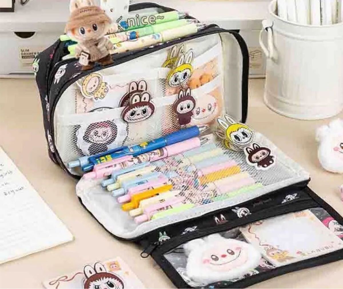ラブブ キャラクター柄ペンケースです。複数のポケットがあり、大容量で収納力に優れています。クリアポケット部分には、様々な表情のキャラクターがデザインされています。文房具の整理に便利なアイテムです。化粧ポーチにもつかえます| 出价者 | 信用 | 价格 | 时间 |