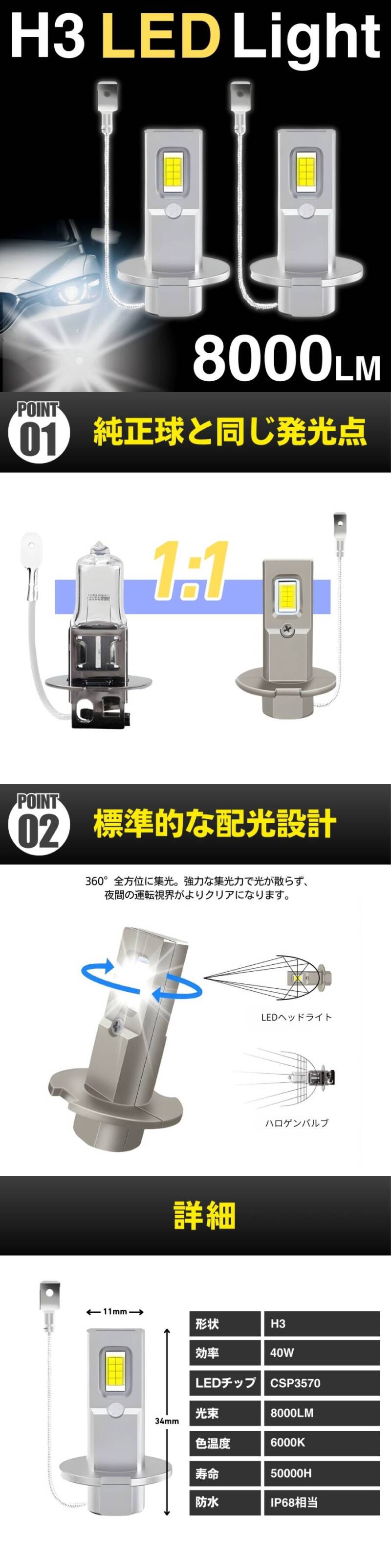 ●商品説明 夜間走行や悪天候時の視認性を劇的に向上させる、高輝度H3 LEDバルブ2個セットです。 純正球の構造をLEDで忠実に再現することで、ハロゲンに近い理想的な配光と綺麗なカットラインを実現しました。 新基準の車検(すれ違い光軸)にも対応しており、対向車への眩しさを抑えつつ、路面を明るく照射します。 色温度6000Kのピュアホワイト光は、愛車のフロントフェイスをスタイリッシュで洗練された印象へと進化させます。 ●機能(特徴) ①圧倒的な明るさ 8000lmの光量で、夜道の不安を解消します。 ②3570 CSPチップ採用 小型ながら強力な発光と安定した配光を両立します。 ③最新の保護システム 定電流回路と過電圧保護回路により、電圧を正確にコントロールします。 ④全天候型設計 IP68レベルの防水防塵性能で、雨天時も安心して走行できます。 ⑤優れた耐久性 放熱性に優れたアルミ合金ボディを採用し、過酷な環境(-40℃〜100℃)に対応します。 ●使い方/取り付け方 純正バルブと交換するだけの一体型設計です。 非常にコンパクトなため、取り付けスペースが狭い車種でもスムーズに装着可能です。 H3規格のヘッドライトやフォグランプにご使用いただけます。 ※安全のため、整備士等のプロによる取り付けを強く推奨いたします。 装着後は必ず試運転を行い、動作に問題がないか確認してください。 ●商品詳細 内容:LEDバルブ×2個 規格:H3 電圧:DC12V 消費電力:40W 色温度:6000K(ホワイト) 明るさ:約8000lm 材質:アルミ合金 防水等級:IP68 |