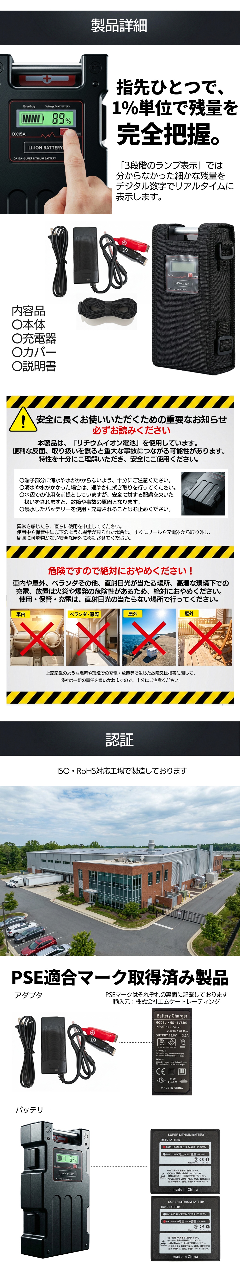 型番:DX15 電圧:定格14.8V/最大16.8V 容量:14000mAh サイズ:192mm×97mm×52mm 認証:安心のPSE・CEマーク取得済 安心のパナソニック製セル搭載!! 商品到着後1ヶ月以内にレビューご記入で長期保証1年間! |