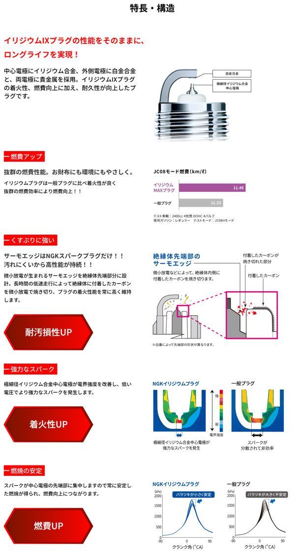 イリジウムIXプラグの性能をそのままに、ロングライフを実現!中心電極にイリジウム合金、外側電極に白金合金と、両電極に貴金属を採用。イリジウムIXプラグの着火性、燃費向上に加え、耐久性が向上したプラグです。