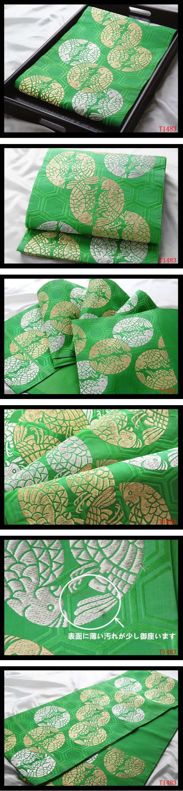 商品寸法 ーーーーーーーーーーーーーーーーー ★商品種類:京袋帯 ★素材:正絹 木箱等付属品なし ★寸法:長さ約354cm 幅約31.5cm ★現物状態:中古 使用少なく 表面に薄い汚れが少し御座いますが、あまり目立たず、良い状態で綺麗な美品でございます。