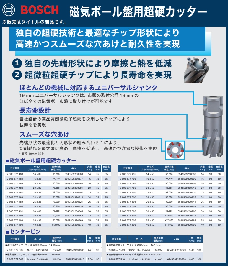 ボッシュ BOSCH磁気ボール盤用超硬カッター2608577494独自の超硬技術と最適なチップ形状により高速かつスムーズな穴あけと耐久性を実現■特長1.独自の先端形状により摩擦と熱を低減2.超微粒超硬チップにより長寿命を実現■ほとんどの機械に対応するユニバーサルシャンク19mmユニバーサルシャンクは、市販の取付穴径19mmのほぼ全ての磁気ボール盤に取り付けが可能です。■長寿命設計BOSCH社設計の高品質超微粒子超硬を採用したチップにより 長寿命を実現■スムーズな穴あけ先端形状の最適化と刃形状の組み合わせ*により、切削動作を最大限に高め、摩擦を低減し、高速かつ容易な操作を実現* 直径 18mm 以上