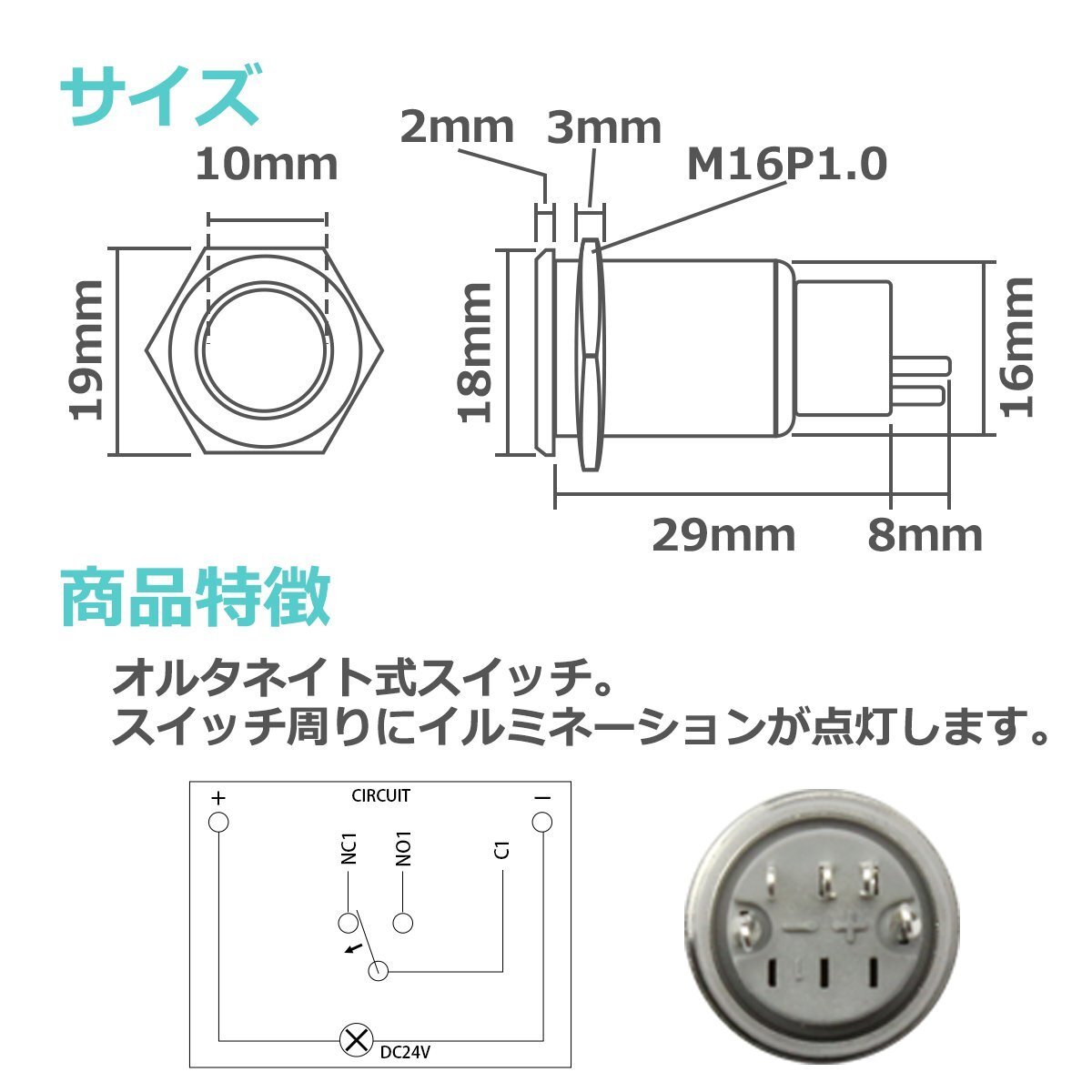 ■商品コード IZ098-R ■仕様 オルタネイト式(スイッチがロックするタイプ) 表面防滴仕様 ステンレスボディ DC24V専用 MAX3A ■発光色 レッド ■サイズ φ18(下穴:φ16) ■数量 1個(回路図付) ■特徴 LEDリングイルミネーション内蔵のオルタネイト式プッシュス イッチ 丈夫なステンレスボディで、表面突起も2mmと薄型を採用。 配線の繋ぎ方によって、 ・常時イルミネーション点灯 ・スイッチONでイルミネーション点灯 ・スイッチOFFでイルミネーション点灯 と、さまざまな点灯方法でご使用いただけます。 ■注意 ※出品商品はタイトルのサイズ・発光色です。 ■関連商品 他の発光色 他のサイズのプッシュスイッチ 他のスイッチ(有線、無線) |