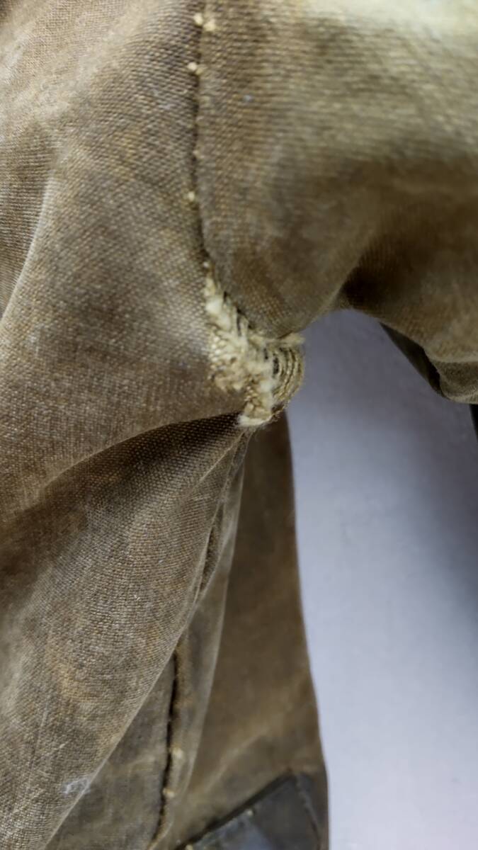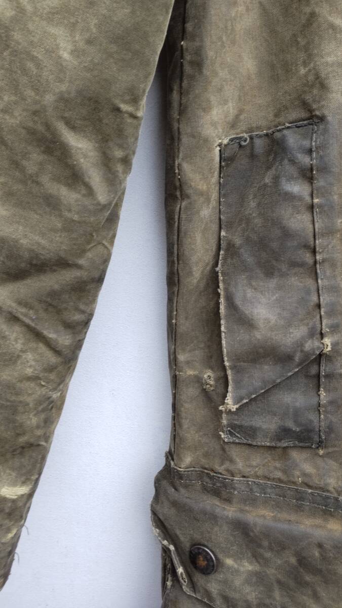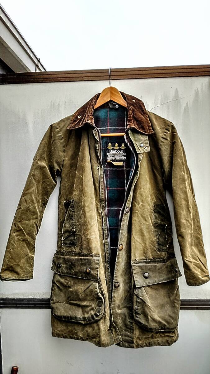数年前にオークションで購入したものになります。ヘビーオンスのワックス生地とウールライナーが使われたBarbourでも上級モデルに分類されたノーザンブリアになります。90s迄使われた3ワラントタグのイギリス製になります。サイズは表記では38とありますが一度シルエットをリメイクカスタムしたようでかなりタイトフィットな作りになっています。リメイクはプロの手による物と思われ裏地を含めて完全に解体して再縫製されてると思います。実寸肩幅約43センチ、身幅約46センチ、着丈約84センチになります。普段sサイズ前後を着る方にお勧めします。着用感はそれなりにあり右脇下にほつれがあり、左裾下に別の生地でのパッチ補修が施されています。ワックスのにおいも少々あります。このようなビンテージ品ですので古着初心者や神経質な方にお勧めしません。これらを判断のうえご検討ください。