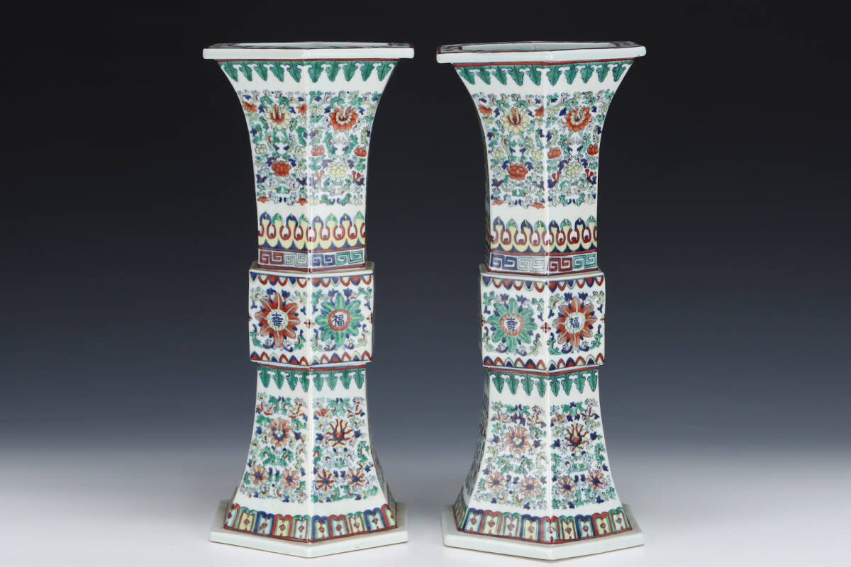 | 中国磁器 陶芸 磁器『大清乾隆青花斗彩六方花觚です』施釉陶 古代工芸品 陶芸 精美彫 置物 收藏品 | |||