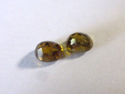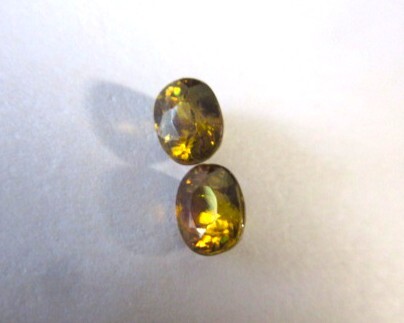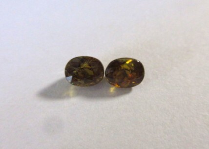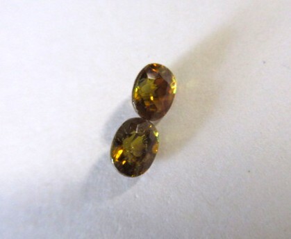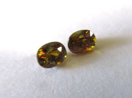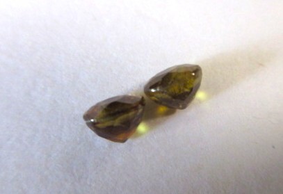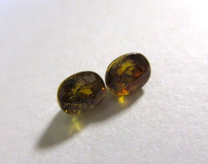 飴色のスフェーンの1ペアです。飴色なので少しわかりにくいですが、赤やグリーンのファイアーがキラキラしています。透明感とテリがあります。非加熱。