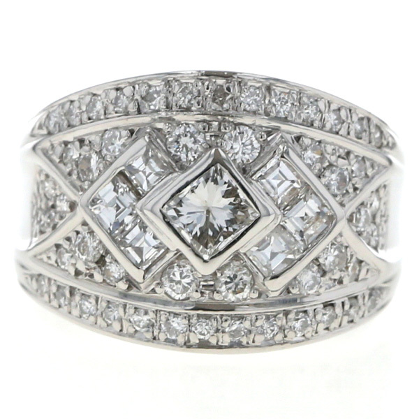 | 商品紹介 | プラチナを贅沢に使用した、幅広で非常に豪華なダイヤモンドリングです。 中央にはプリンセスカットのダイヤモンドをメインに配し、その周囲をスクエアカットやラウンドカットのダイヤモンドのパヴェが取り囲む、立体的なデザインです。 幾何学的な模様を描きながら隙間なく敷き詰められています。 指元に圧倒的なボリューム感と、多面的な石の輝きが際立つ豪華絢爛なハイジュエリーです。 |