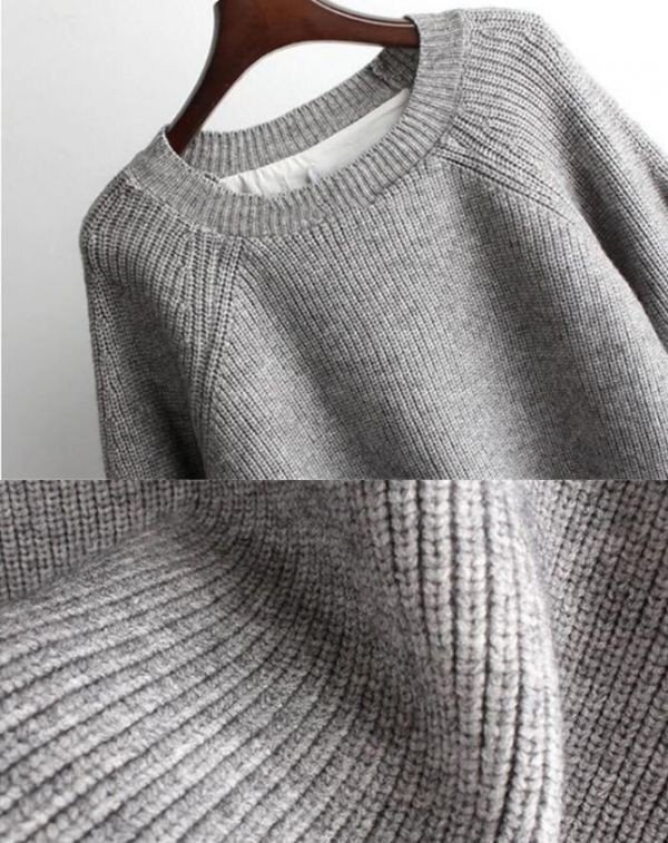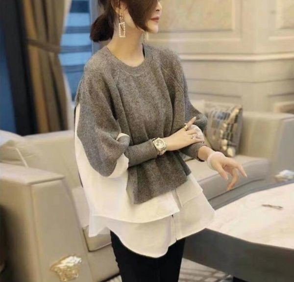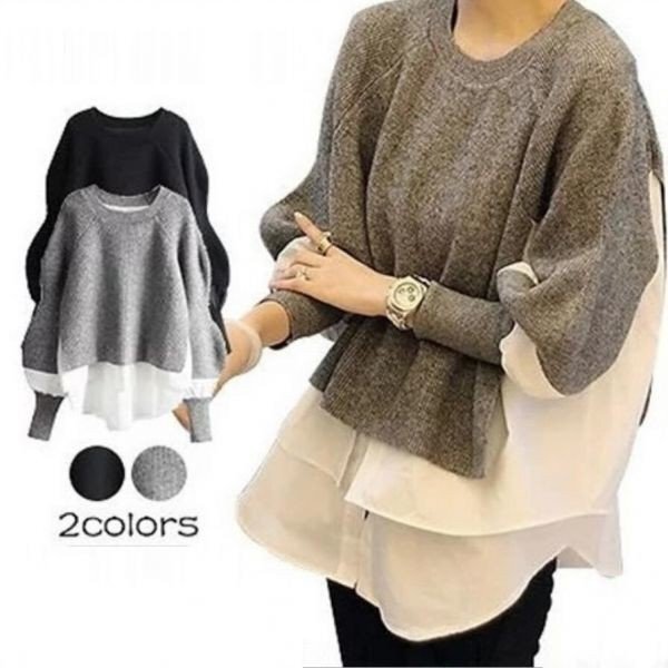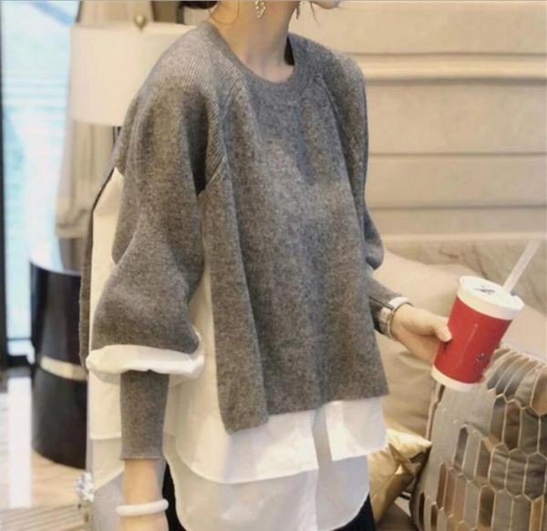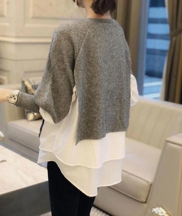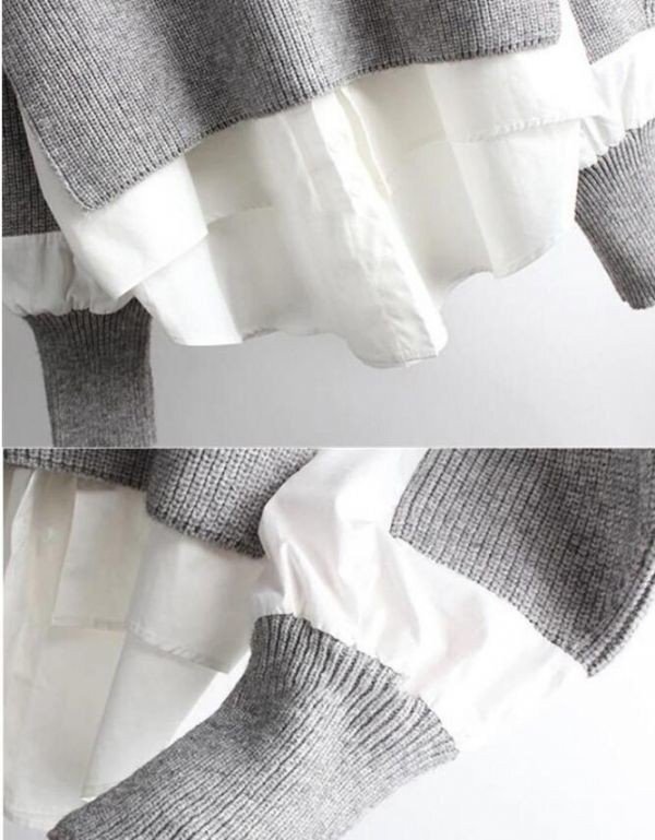 秋冬カジュアルおしゃれ ニットセーター切り替え 大きいサイズ トップス チュニック★グレー/XLサイズ [浏览原始页面]