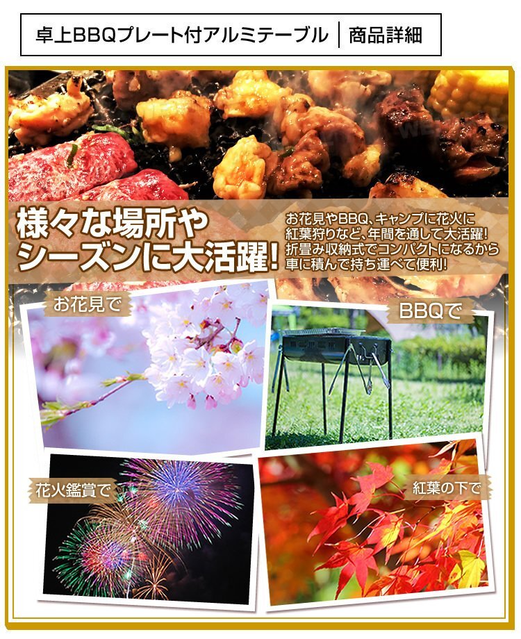 バーベキューコンロが設置できるアウトドアテーブル。 軽量アルミ製+取っ手付きで、アウトドアやBBQにぴったり!! 組み立てはとっても簡単! 開いてロックするだけの簡単設置タイプなので女性一人でも気軽に組立てができます。 バーベキューコンロを設置する場合は、天板のプレートを裏返し、フックに取り付けるだけで超簡単です。 もちろんフタを閉じればフラットテーブルとしてお使いいただけます♪ テーブルは2段階の高さ調節ができ、ローテーブルとしても使うことが可能。 【商品仕様】 折りたたみ式 テーブルサイズ(約):幅135×奥行65×高さ40/70cm ※高さ二段階調節 バーベキュー部サイズ:幅40×奥行54cm 収納サイズ(約):幅65×奥行10.5×高さ45cm 材質:(天板)MDFボート(耐熱・防水加工) (外枠)アルミニウム、スチール、ポリプロピレン他 重量:(約)6.7kg 耐荷重(約):25kg(コンロ部:10kg) ●注意事項 海外製品で簡易梱包での輸入の為風防に擦れや多少の小キズなどがある場合がございますが、商品自体には問題ありませんのでご了承下さい。 商品コード:A61135 |
