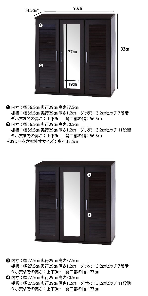 | 備 考 | ■リビングボードとしても使えます。 ■食器収納等にも便利なキャビネットです。 ■ミラー付きで足元を確認できます。 |