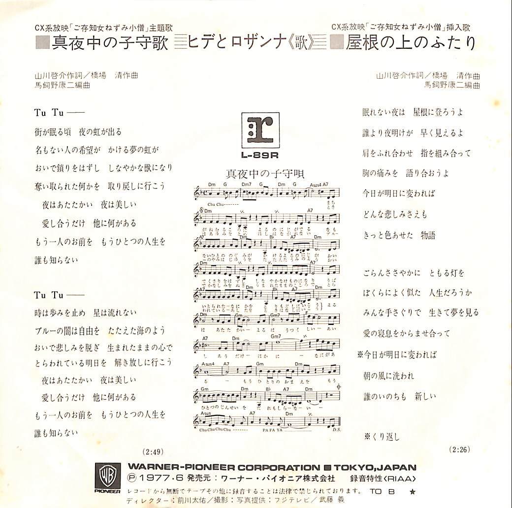 C00176914/EP/ヒデとロザンナ「ご存知女ねずみ小僧 主題歌 真夜中の子守歌 / 屋根の上のふたり (1977年・L-89R・サントラ)」