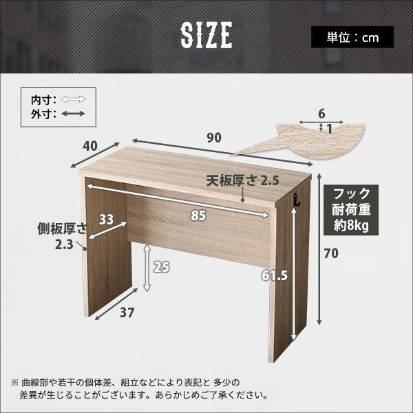 | 子どもから大人まで使えるリビングに合うヴィンテージシンプルデスク90cm幅! スタイリッシュ&スマートで場所や用途を選ばず使える万能ワークデスクです。 教科書&ノートを広々置ける学習机に。 趣味や家事のワークスペースとしても使えます。 しっかりした厚みの天板はキズや書き跡に強いPVC仕様です。 デスクのサイドにはランドセルやバッグが掛けれるフック付きです。 デスクの背面にはライトやパソコンのコードを通せる隙間を作っているので、スッキリ収納できます。 |