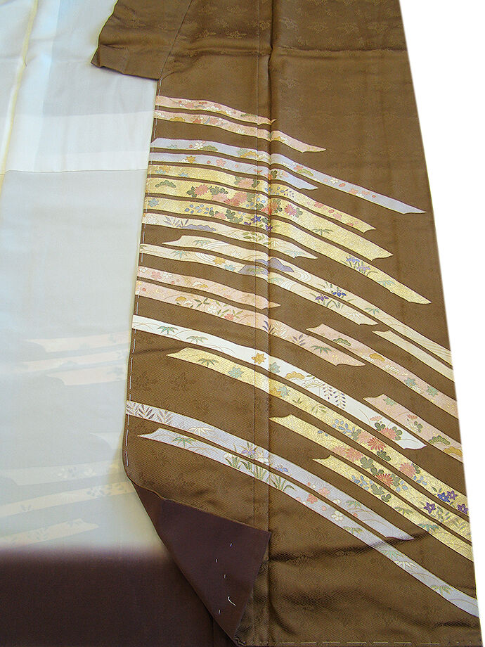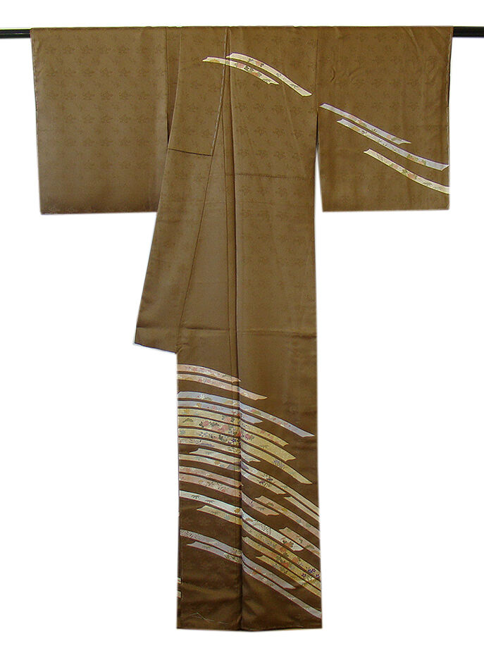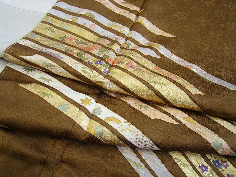 | 商品説明 | こちらのお品は「袷」ですので10月から5月までお召頂ければと思います。 とてもしなやかでんさらりとした滑らかな手触りの着心地良い重めの紋意匠の生地、 路考茶色地に地模様入りに花草柄の染柄に金彩加工仕立て、 八掛は渋い胡桃色(正絹)、幅広い年代の方にお召頂けます。 |