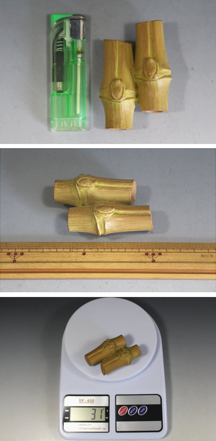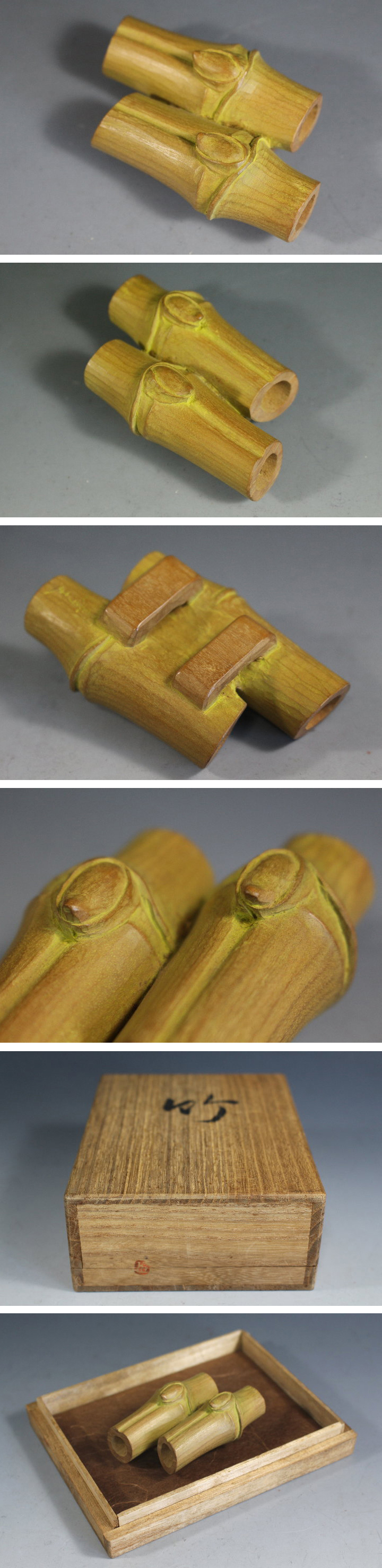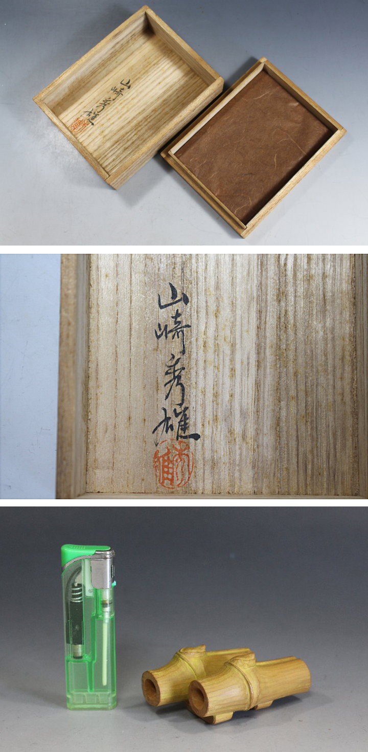 サイズ:最長7.0cm 山崎朝雲門下 山崎秀雄(山崎如悦)氏の木彫竹 帯止めです。 白檀材に竹を彫刻した帯止めですが、大きさもあり根付に 使用出来るのではないでしょうか。 鼻を近づけると微かに白檀の香りがします。 目立つ傷みはありません。 共箱。 写真をご覧の上ご入札宜しくお願い致します。 ◆山崎秀雄 やまざ-きひでお 明治40年(1907)~平成17年(2005) 福岡市に生まれる。高等小学校卒業後、博多で堀祐峰に木彫を学ぶ。 昭和02年 上京し大叔父にあたる山崎朝雲に入門。 昭和11年 修行を終えたが、助手として仕え師の制作を助けた。 昭和07年 帝展に初入選、福岡県展創設に参加し、筑前美術会展にも出品。 戦後は主に日彫展で、穏やかで写実的な作品を発表。 また、如悦と号して肖像彫刻や香合などの茶道具も制作。 | |