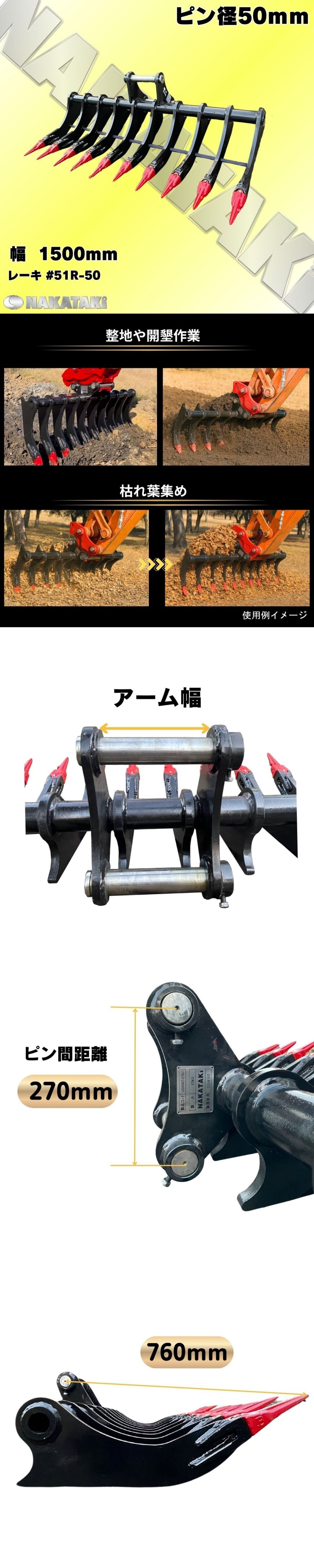 レーキ NAKATAKI #51R-50 Vio70 308DCR PC70-6 PC75UU-2 PC78US-6 ZX75US SK70SR 幅1500mm 集草 除草 整地 重機 バケット ユンボ 人気 [浏览原始页面]