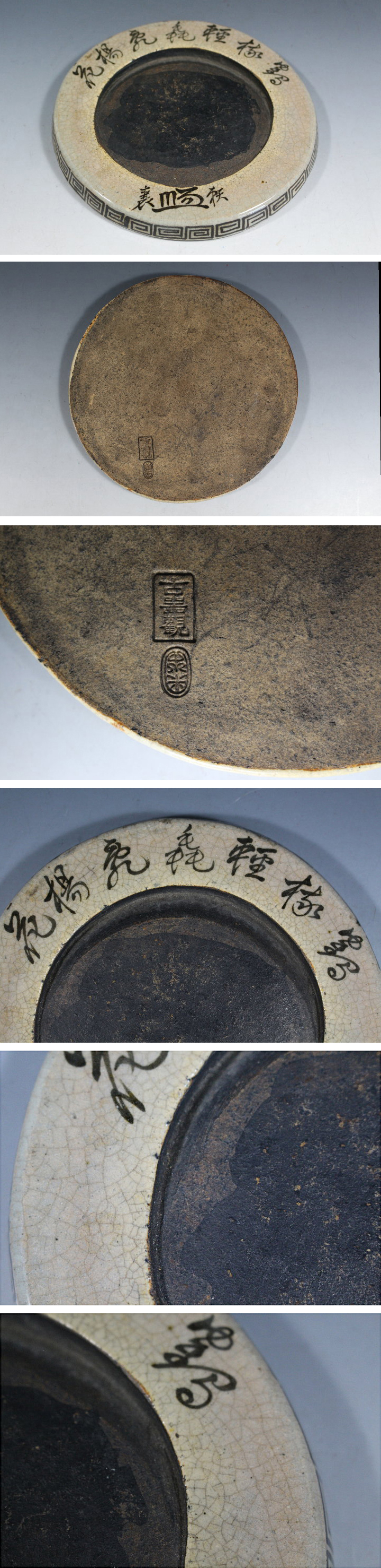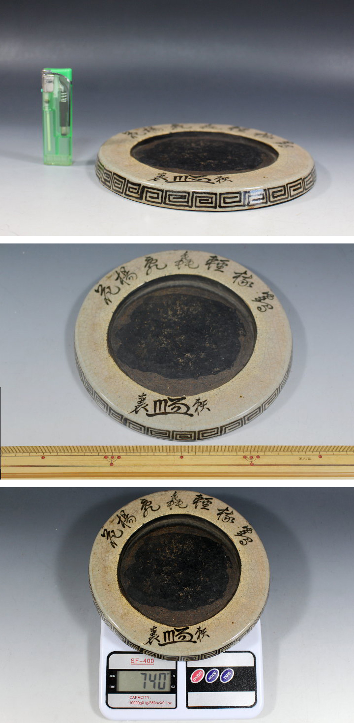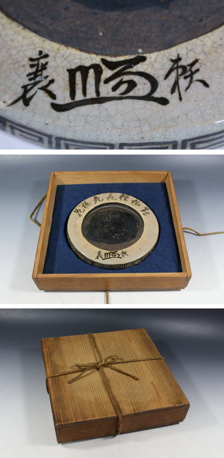 サイズ:径18.0cm 青木木米の円面陶硯です。 硯上部に「鶴棲軽毳飛楊花」の文字。 下部に「頼襄」署名と花押。 目立つ大きな傷みはありません。 写真をご覧の上ご入札宜しくお願い致します。 鶴棲軽毳飛楊花(鶴棲みて軽し 毳の楊花を飛ばすごとし) 鶴棲軽(つるすみてけいく): ツルが(軽やかに)とまっている様子。 または、ツルが巣を作る(棲)様子を詠んだもの。 毳飛楊花(ぜいとんでようか): 毳(鳥の羽毛、または綿毛)が舞い飛び、 柳の花(柳の綿毛)が風に舞っている様子。 ◆青木木米 あおき-もくべい 明和4年(1767)~天保4年(1833) 江戸時代の絵師、京焼の陶工である。京都生まれ。幼名は八十八。 字は佐平。号は青来、百六散人、古器観、亭雲楼、九九鱗、木米、聾米。 若くして高芙蓉に書を学び頭角を現す。 29歳の時「陶説」を読んで感銘を受けて作陶を志す。 奥田頴川に入門。 30歳を境に京都・粟田口に窯を開き評判を得る。 5年後、加賀藩前田家の招聘を受け、絶えていた九谷焼の再生に尽力。 陶工としては煎茶器を主に制作。 白磁・青磁・赤絵・染付などその作域は幅広い。 中国古陶磁への傾倒から中国物の写しに独自の世界を開いた。 文人画系統に属する絵画にも秀作が多い。 天保4年(1833)死去。享年67。 永樂保全、仁阿弥道八とともに京焼の幕末三名人とされる。 ◇頼山陽 らい-さんよう 安永9年(1780)~天保3年(1832) 江戸時代後期の歴史家・思想家・漢詩人・文人。 大坂生まれ広島育ち。幼名は久太郎 名は襄(のぼる)・字は子成。 山陽・三十六峯外史と号した。 主著『日本外史』は、幕末から明治にかけて広く読まれ、 尊王倒幕の志士に影響を与えた。 | |