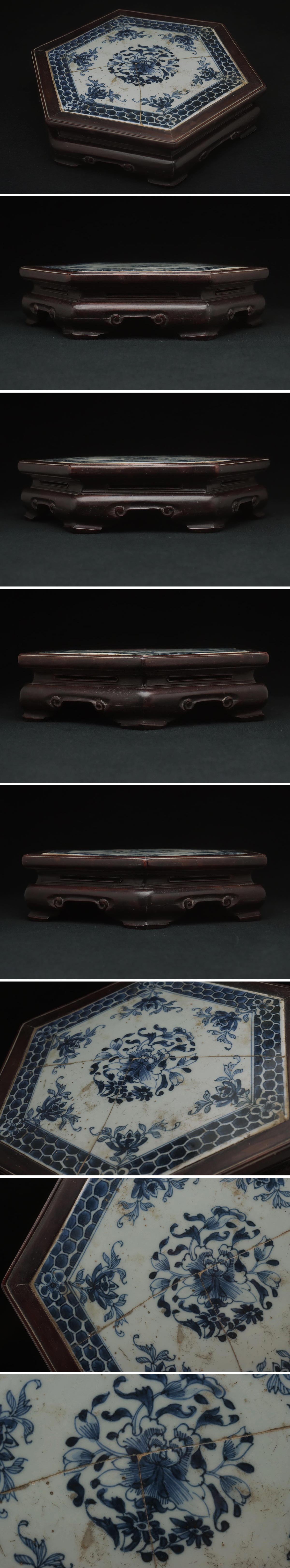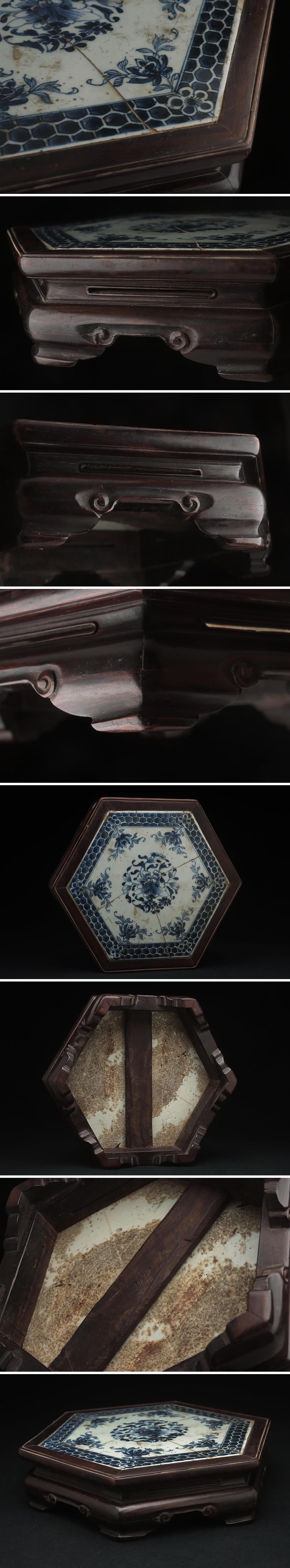 | ◆ 唐物 紫檀嵌青花牡丹圖六方底座 高7.3cm・染付瓷板唐木六角台・花台・飾台・盆景台・香几 中国古玩 古美術 清時代 ◆