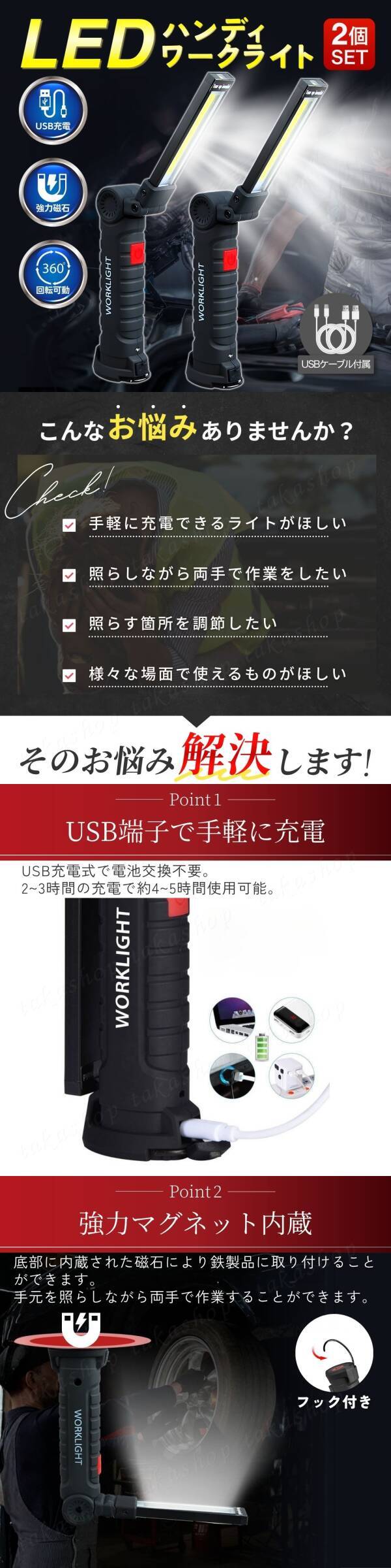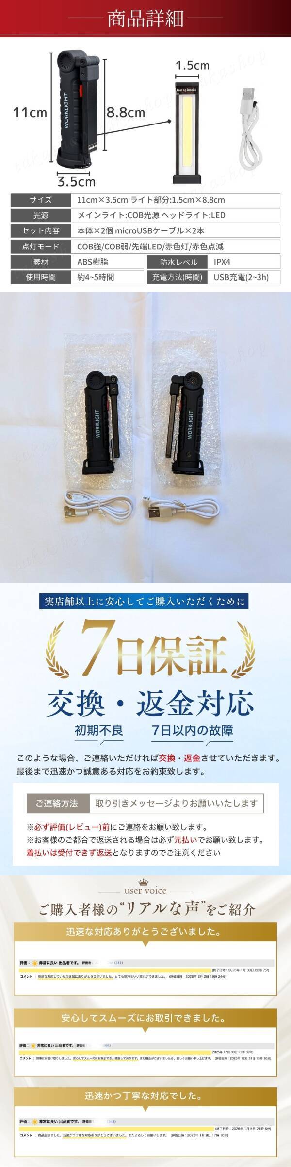 | 商品説明 | ご覧いただきありがとうございます。 ●商品説明 USB充電で手軽に使用できる小型のハンディライトです。 底面に磁石があり先端を360度回転させることができるので場所を選ばず使用することができます。 5種類のライトモードがあり、屋内屋外だけでなく赤色灯で緊急時などの様々なシーンでも使用することができます。 ・USB端子で手軽に充電 USB充電式で電池交換が不要です。 2~3時間の充電で約4~5時間使用可能です。 ・強力磁石で鉄製品に設置が可能 底部に内蔵されたマグネットにより鉄製品に設置することができます。 そのため、手元を照らしながら両手で作業することができます。 フックも付いているので引っ掛けて使用することも可能です。 ・2種類の光源と5種類の点灯モード 広範囲を照らすCOB光源と前方をスポットして照らすLED電源を備えています。 また、ロウライトモード、ハイライトモード、LEDライトモード、レッドライトモード、レッドライトフラッシュモードにボタンで切り替えることができます。 ・IPX44の防水性能 防水性、耐摩耗性や耐落下性などが優れているため、屋内、屋外、雨天時など様々な場所で活躍できます。 ●商品詳細 サイズ:11.5cm×3.5cm ライト部分:1.5cm×8.8cm 光源:メインライト:COB光源 ヘッドライト:LED 素材:ABS樹脂 点灯モード:COB強/COB弱/先端LED/赤色灯/赤色点滅 使用時間:約4~5時間 充電方法:USB充電(充電時間:2~3h) 防水レベル:IPX4 セット内容:本体×2個 micro-USBケーブル×2本 ●発送について 【ゆうパケットポストminiで発送します】 発送日 :お支払い後1〜3日以内(平日) 到着目安:発送後2〜4日程度 ※遠方の方はもう少しかかる場合もございます 【配送方法の変更はできません】 ●お願い ・商品画像の転載や説明文のコピーはお止め下さい ※見つけたら通報しています ・ 海外製品のため、細かな汚れや傷がある場合があります。予めご了承ください ・即購入OK ・コメントなしOK 〇初期不良は対応しますので、何かあれば「評価前に」ご連絡下さい |