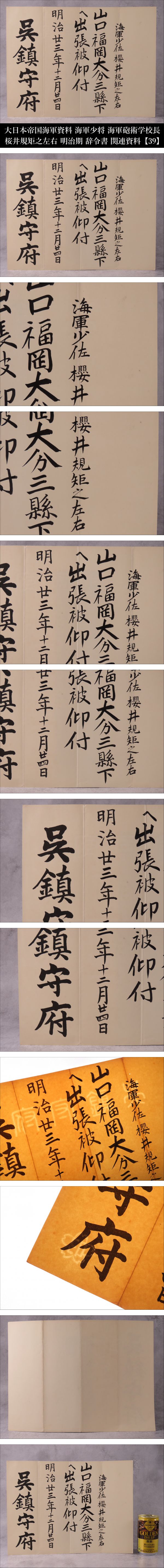 | Lot.20260423HA251129OSX/10 ※ご入札いただいた時点で下記記載事項全てにご了承いただいたものとさせていただきます。 ※商品タイトルは当方判断に基づき記載しております。また単にキーワードとして記載している場合もございますので予めご了承ください。 【ONE'S】大日本帝国海軍資料 海軍少佐 海軍砲術学校長 桜井規矩之左右 明治期 辞令書 関連資料 呉鎮守府 明治二三年十二月二四日 【39】 桜井 規矩之左右(さくらゐ きくのすけ) 嘉永元年6月6日(1848年7月6日) - 大正元年(1912年11月27日)64歳没 日本の武士、大日本帝国海軍の軍人。海軍兵学校3期。最終階級は海軍少将。 海軍砲術学校長、巡洋艦「比叡」「松島」「千歳」「橋立」の艦長を歴任。 日清戦争において比叡艦長として特に黄海海戦で功績を残しました。 彼の貢献は日本の海軍史において重要な位置を占めています。 《幕末の佐倉藩に生まれ、海軍の礎を築いた「海の侍」。日清戦争・黄海海戦にて、絶望を希望に変えた奇跡の突撃。敵の巨大戦艦に包囲され、沈没か降伏かの絶体絶命の淵に立たされた軍艦「比叡」。その極限状態の中、桜井は「敵陣中央突破」という戦術の常識を超えた決断を下した。炎の中を突き抜けたその一閃は劣勢だった日本海軍を奮い立たせ、日本の運命を変えた伝説の男。》 なかなかお目にかかることのないお品物をこの一期一会のご機会にぜひ。 【商品状態】 掲載画像をご覧下さい。 あくまでも年代物かつ一度人の手に渡っているお品物のため、汚れ、変色、経年による劣化等があるものとお考えいただき、神経質な方のご入札はお控えください。 PC上の画像と商品の色目が若干異なる場合がございます。 説明文に記載のある品物や写真に写っているもの以外は基本的に付属致しておりません。 落札後のトラブルを避ける為にも、説明文および画像をよくご覧になってから、ご入札のほどよろしくお願い致します。 商品状態の記載に関してはあくまでも当方判断基準となっております。 状態等の詳細は写真をご確認いただき購入者各自のご判断にてご入札ください。 | |||