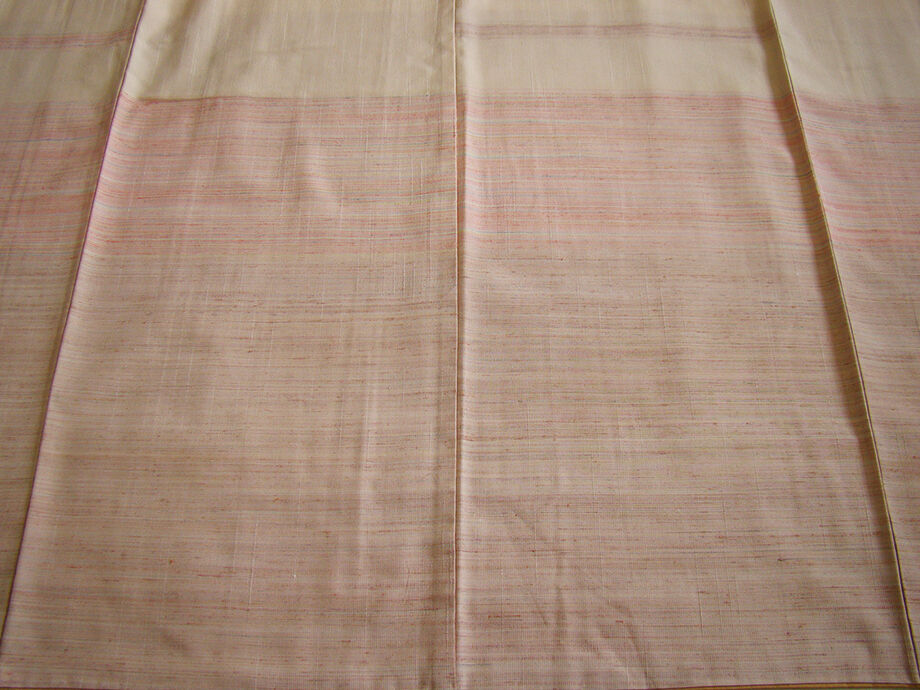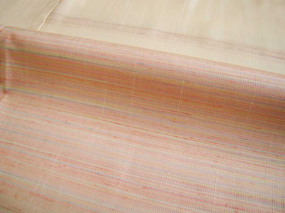 | 商品説明 | こちらのお品は「袷」ですので10月から5月までお召頂ければと思います。 とてもしなやかで柔らかな手触りの紬地、着易く動きも軽く、着くずれしない腰の強さを 併せ持ったお洒落着としていつでもどこへでもお気軽にお愉しみ頂けご愛用頂けるお品です。 灰梅色地に赤、水色等の細縞の横断柄の織柄、 八掛は飴色(正絹)、幅広い年代の方にお召頂けるでしょう。 |
