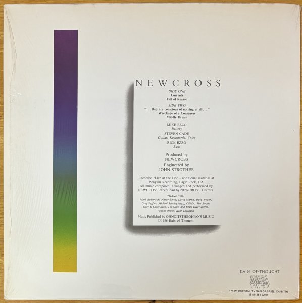 【 収録曲 】 A1. Currents 5:15 A2. Fall Of Reason 6:10 B1. ...They Are Conscious Of Nothing At All... 4:00 B2. Wreckage Of A Consensus 3:33 B3. Middle Dream 4:53 【 Credits 】 Bass Rick Ezzo Drums Mike Ezzo Engineer John Strother Guitar, Keyboards, Vocals Steven Cade Producer Newcross ※NewcrossはDiscipline時代のKCとRedのよりアグレッシブなサウンドをミックスしている... ( rateyourmusicより抜粋 ) ※ニュークロスはドラムス、ギター (キーボード、ヴォーカルも兼ねる)、ベースの3人から成るアメリカの新人バンドである。本作品は彼らのデビューEP(33回転)で、全5曲、24分弱の演奏が収められている。そのサウンドは第3期“ディシプリン”キング・クリムゾンに通じるもので、ドラムスを中心にした切れの良いリズムとムードあるヴォーカル、メロディアスなギター、キーボードの絡みが聴き所と言える。たたみかけるような演奏からゆったりとしたものまで起伏に富んだ展開となっており、彼らの演奏力及び構成力がともに高い水準にあることを窺わせる。現在、徐々に解明されつつあるアメリカのプログレッシヴ・ロック・シーンにおいてもトップ・クラスに位置する作品の一つ。 ( アメリカン・ロック集成より ) ※アメリカ産プログレでシンフォとJazz Rockの中間のサウンド。80年代のJap’s Progにも近いものがあります。この作品以外は探してみましたが、見当たらず。「Middle Dream」を聴くと少しだけヴォーカルがジョン・ウェットン似かなと思います。ちょっぴり後期クリムゾンであるかも知れません。 【 参考音源 】 Newcross (1986) (Progressive Rock) |