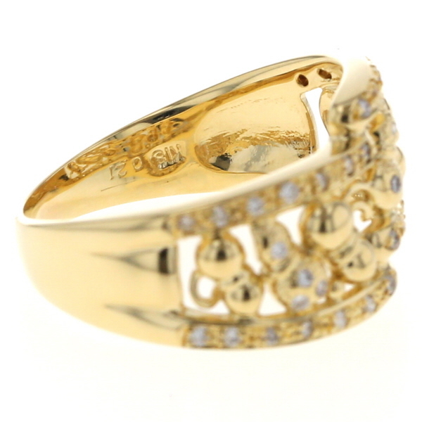 | 商品紹介 | イエローゴールドの地金に、複数のダイヤモンドを散りばめた華やかなリングです。 ふっくらとしたポットのような丸みのあるデザインと、軽やかな透かし模様が組み合わさり、指元に優しい印象を与えます。 アームのZ型デザインが、全体のバランスを引き締めるアクセントとなり、個性的でありながらも身につけやすいジュエリーです。 |
