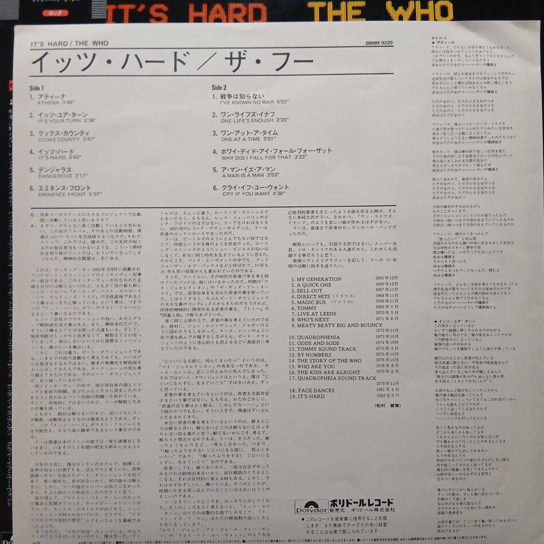 日本POLYDOR、LP、プロモ非売品。1982年。レアなザ・フーのプロモ見本盤の白ラベル。再結成までのラスト・アルバム。ドラムは元スモール・フェイセズのケニー・ジョーンズ。ジャケ、盤ともにすこぶる状態いいですよ。ザ・フーのプロモ盤はめったに市場に出ないのでぜひ。しかも帯付き。