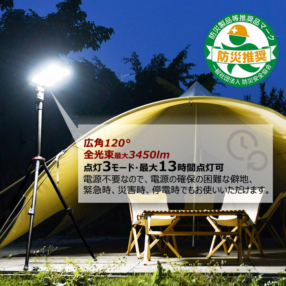 | 点灯時間 | HIGH:2時間 MIDDLE:4時間 LOW:13時間 | 照射角度 | 120°(HIGH・LOW)/15°(MIDDLE) |