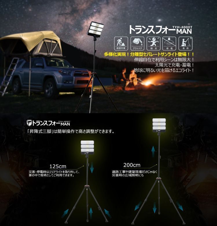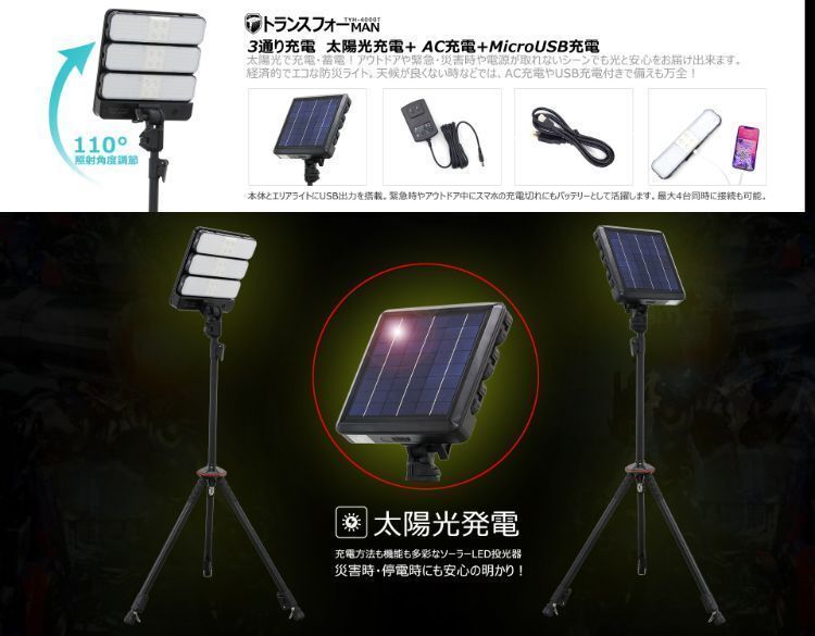 | 充電時間 | AC電源:約8-10時間 ソーラー充電:約24時間 | 充電方法 | AC充電器:AC-DC12V 2A ソーラーパネル:10W(最大) USB充電(エリアライト):5V 1A |