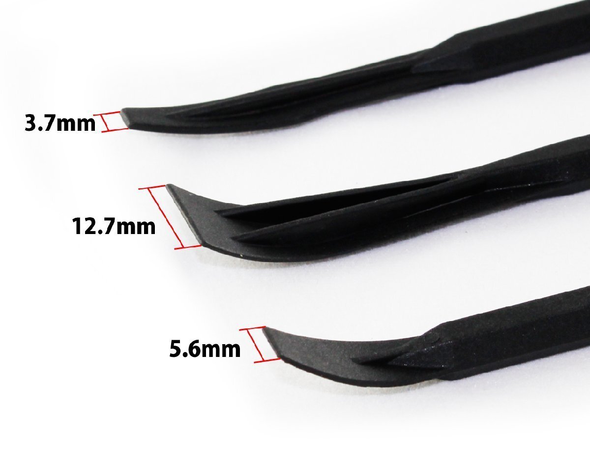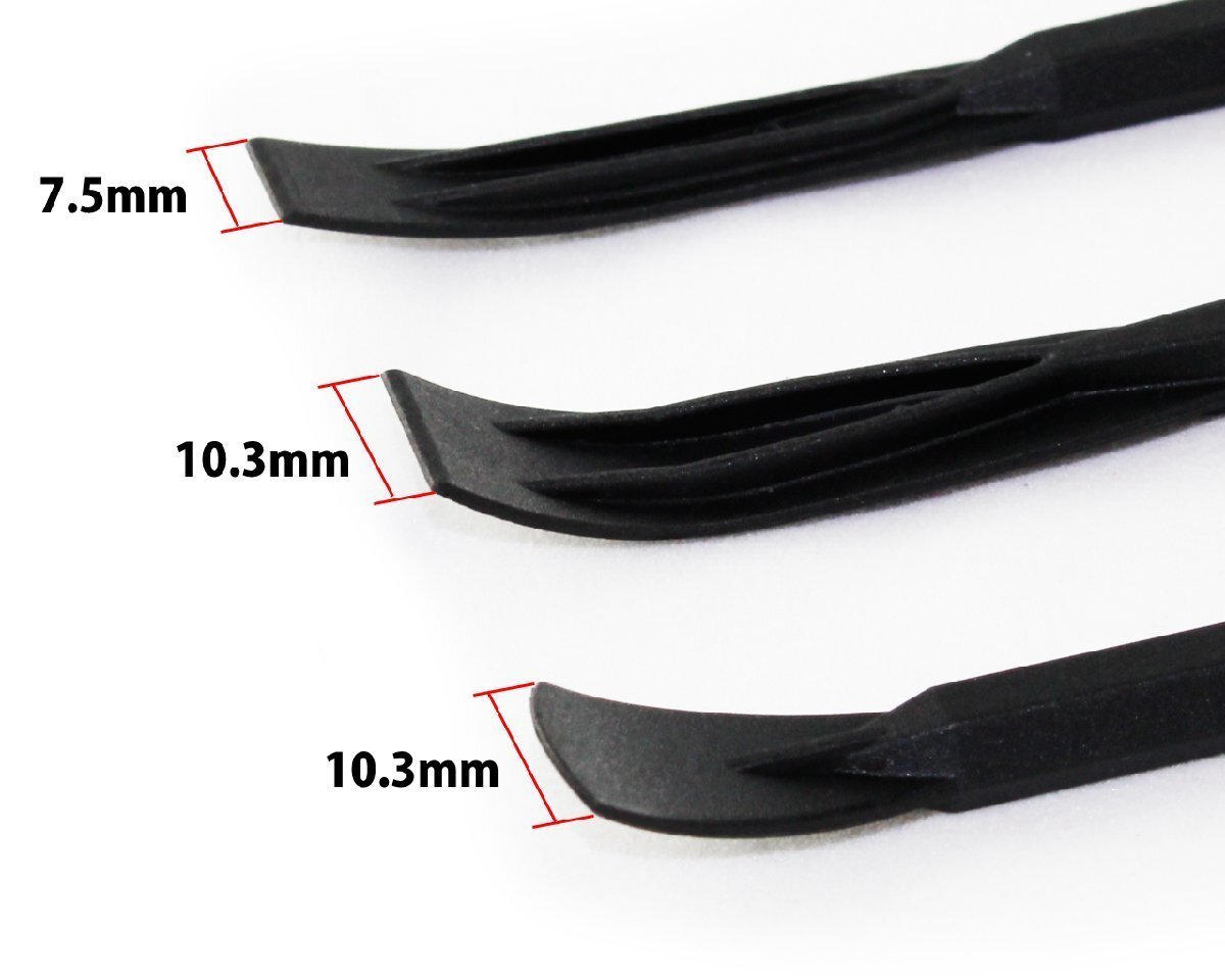 | 特 徴 | 強いガラス繊維を含んだ強化ナイロン素材となる為、 柔軟性を持ちながらもしっかりした強度を持ち合わせています。 又、非摩擦複合材料となるので軟質金属、塗装面、複合材料に傷を付け難くなっています。 先端部分は平たく薄いR形状となり、その素材の性質を生かす事で、何かと便利に使える工具です。 全長は183mm、それぞれ先端幅が5.6×10.3mm、10.3×12.7mm、3.7×7.5mmの3種類です。 実際に使用する用途としては、自動車のキーレスの電池交換作業、接着剤、シリコンなどの均一化作業、 ダッシュボード、ガスケットなどの取り外し作業に塗装面にも安心して使用できます。 |
