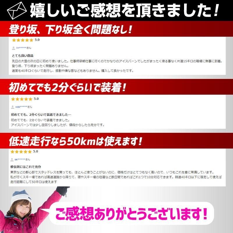 | 本商品の装着時の制限速度は40km/hです。40km/h以上の速度を出しますと脱落及び重大な事故の要因となりますので制限速度は厳守して下さい。 2輪駆動車の場合は通常駆動輪に装着してご使用下さい。ミニバンやワンボックス車は4輪に装着するとより安定性が増します。必ず装着タイヤに適合したサイズであることをご確認ください。 極端な偏平タイヤの場合、サイドウォールへのかかりが浅くなり脱落の危険性が増しますのでご注意ください。 耐久性は路面の状態や運転状況によって異なり、アスファルト及びコンクリート露出路面での装着走行は破損及び製品寿命を著しく低下させます。 本商品はあくまでも急な積雪時などの緊急用としてご使用ください。タイヤ形状や偏平率、空気圧等の条件によっては適合サイズであっても装着しにくい場合や車種によっては装着ができない場合がございますので予めご了承ください。 本商品に破れ等の破損が生じた場合は、速やかに使用を中止して下さい。 本商品は改良などの理由で仕様が予告なく変更になる場合があります。 本商品のご使用時に発生したいかなる事故、損傷等におきまして弊社は一切の責任を負いかねます。 |