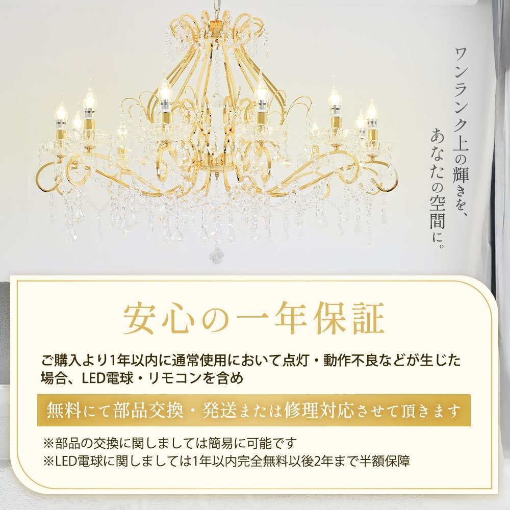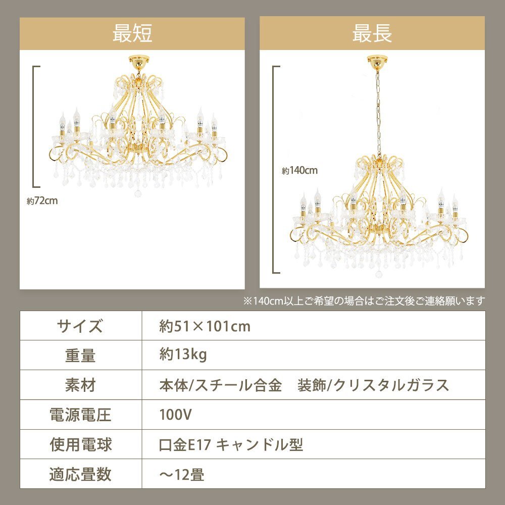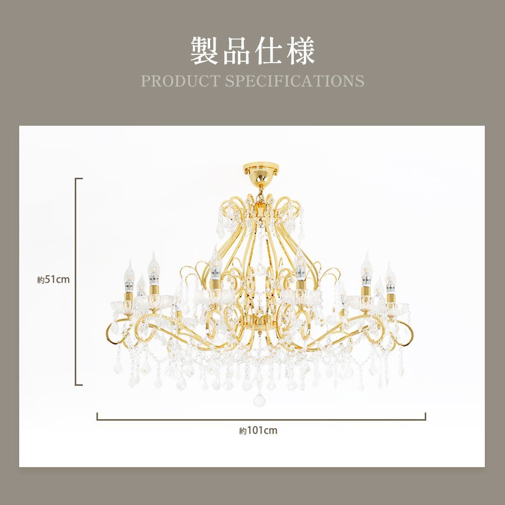 | 商品説明 | ![]() ☆LED電球サービスキャンペーン開催中!☆【送料無料!】新品 豪華 キャンドル12灯 LED クリスタル シャンデリア ワイド 101cm♪ ●キャンペーン期間中 広角LED電球12灯(¥14400-相当)お付けいたしまして驚きのプライス! ☆LED電球サービスキャンペーン開催中!☆ ※通常電球別売の為、価格記載の電球画像掲載がございますがキャンペーン期間中は無償提供(調光別途¥200-)させて頂いております※ ☆上質水晶ならではの最高の輝きを放つ新品クリスタルシャンデリア ☆添付画像では肉眼で見る本来のクリスタルの輝きをご確認いただけませんが、12灯の電球が上質クリスタル水晶を通し光の屈折で光の持つ本来のカラーをかもし出しダイヤモンドのように輝きながらワット数以上の明るさでお部屋を照らします ☆スタイルは飽きの来ないシンプルなデザインです♪ ☆とても明るく豪華なシャンデリアです ☆シャンデリア本体は調光にも対応しております ※調光ご希望の場合、調光対応LED1個¥200-アップと汎用調光器(Panasonic製LED用調光器推奨)が必要です ☆付属電球・・・口金E17広角LED白色又は暖色12灯(明るさ40ワット消費電力4ワット 暖色36Lm/W・白色40Lm/W) ※調光対応LED1個別途¥200- ※ご注文後ご希望のLED電球をお申し付けください ☆取り付けに関しましてはワンタッチでは御座いませんが(配線はワンタッチ)引掛けシーリングに対応しております ☆リビング等に最適なゴージャスクリスタルシャンデリアを是非この機会に! ☆サイズ・天井より下に最短72cm(飾り部分含む)から最長140cmまで調整可能 直径約101cm 重量約13キロです ※140センチ以上ご希望の場合はご注文後お申し付けください ![]() |