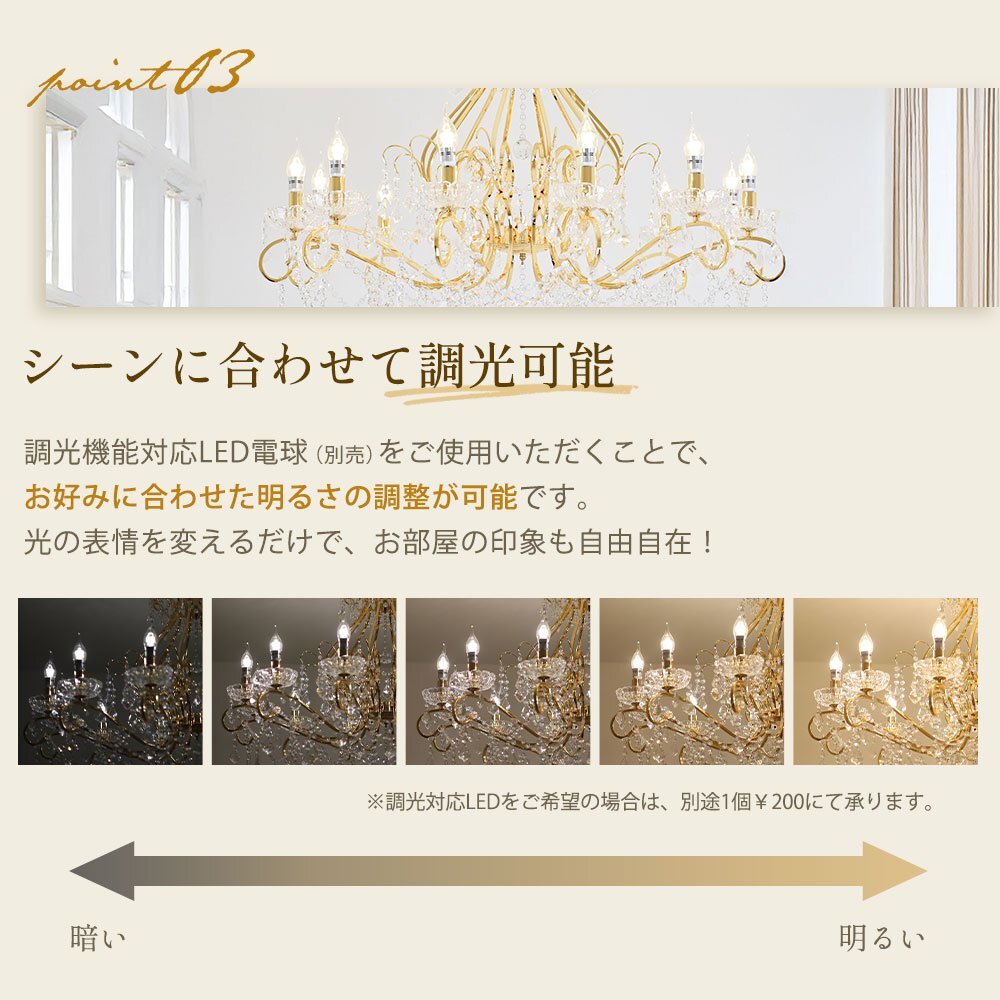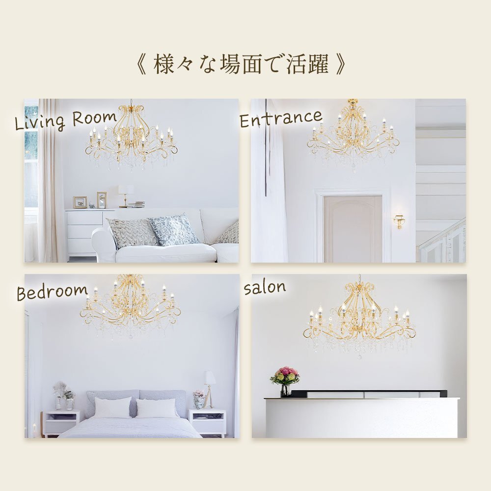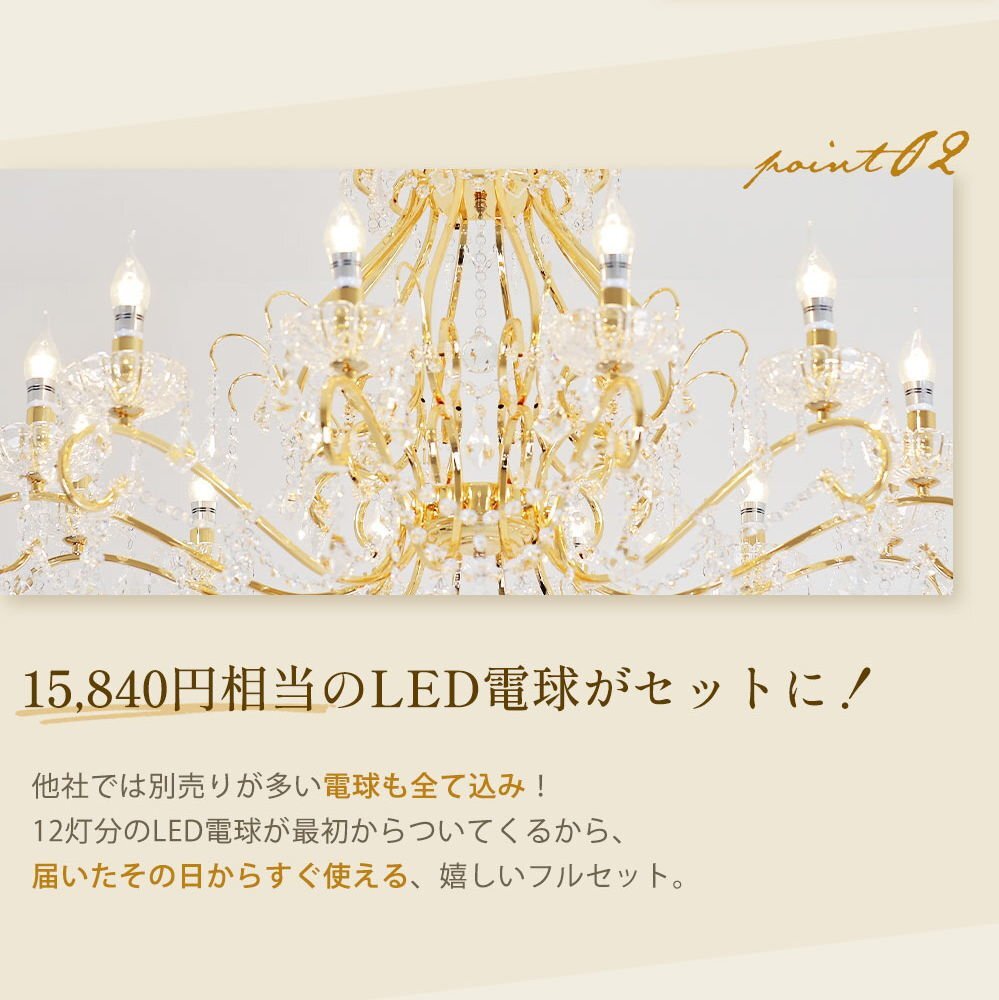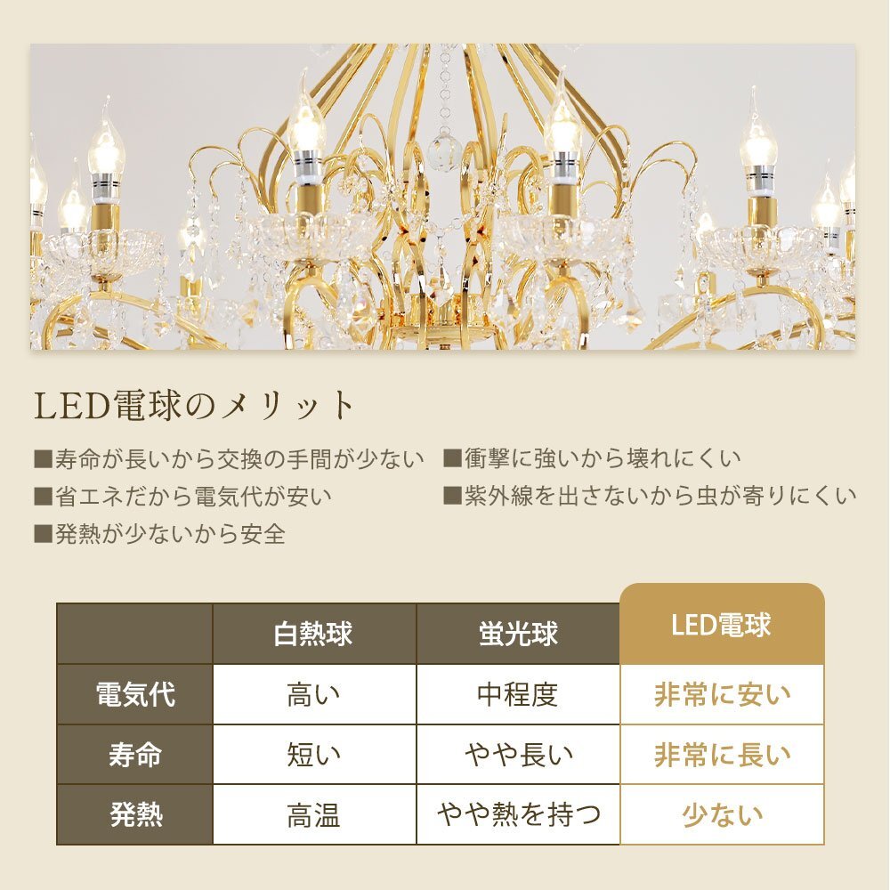 | 商品説明 | ![]() ☆LED電球サービスキャンペーン開催中!☆【送料無料!】新品 豪華 キャンドル12灯 LED クリスタル シャンデリア ワイド 101cm♪ ●キャンペーン期間中 広角LED電球12灯(¥14400-相当)お付けいたしまして驚きのプライス! ☆LED電球サービスキャンペーン開催中!☆ ※通常電球別売の為、価格記載の電球画像掲載がございますがキャンペーン期間中は無償提供(調光別途¥200-)させて頂いております※ ☆上質水晶ならではの最高の輝きを放つ新品クリスタルシャンデリア ☆添付画像では肉眼で見る本来のクリスタルの輝きをご確認いただけませんが、12灯の電球が上質クリスタル水晶を通し光の屈折で光の持つ本来のカラーをかもし出しダイヤモンドのように輝きながらワット数以上の明るさでお部屋を照らします ☆スタイルは飽きの来ないシンプルなデザインです♪ ☆とても明るく豪華なシャンデリアです ☆シャンデリア本体は調光にも対応しております ※調光ご希望の場合、調光対応LED1個¥200-アップと汎用調光器(Panasonic製LED用調光器推奨)が必要です ☆付属電球・・・口金E17広角LED白色又は暖色12灯(明るさ40ワット消費電力4ワット 暖色36Lm/W・白色40Lm/W) ※調光対応LED1個別途¥200- ※ご注文後ご希望のLED電球をお申し付けください ☆取り付けに関しましてはワンタッチでは御座いませんが(配線はワンタッチ)引掛けシーリングに対応しております ☆リビング等に最適なゴージャスクリスタルシャンデリアを是非この機会に! ☆サイズ・天井より下に最短72cm(飾り部分含む)から最長140cmまで調整可能 直径約101cm 重量約13キロです ※140センチ以上ご希望の場合はご注文後お申し付けください ![]() |