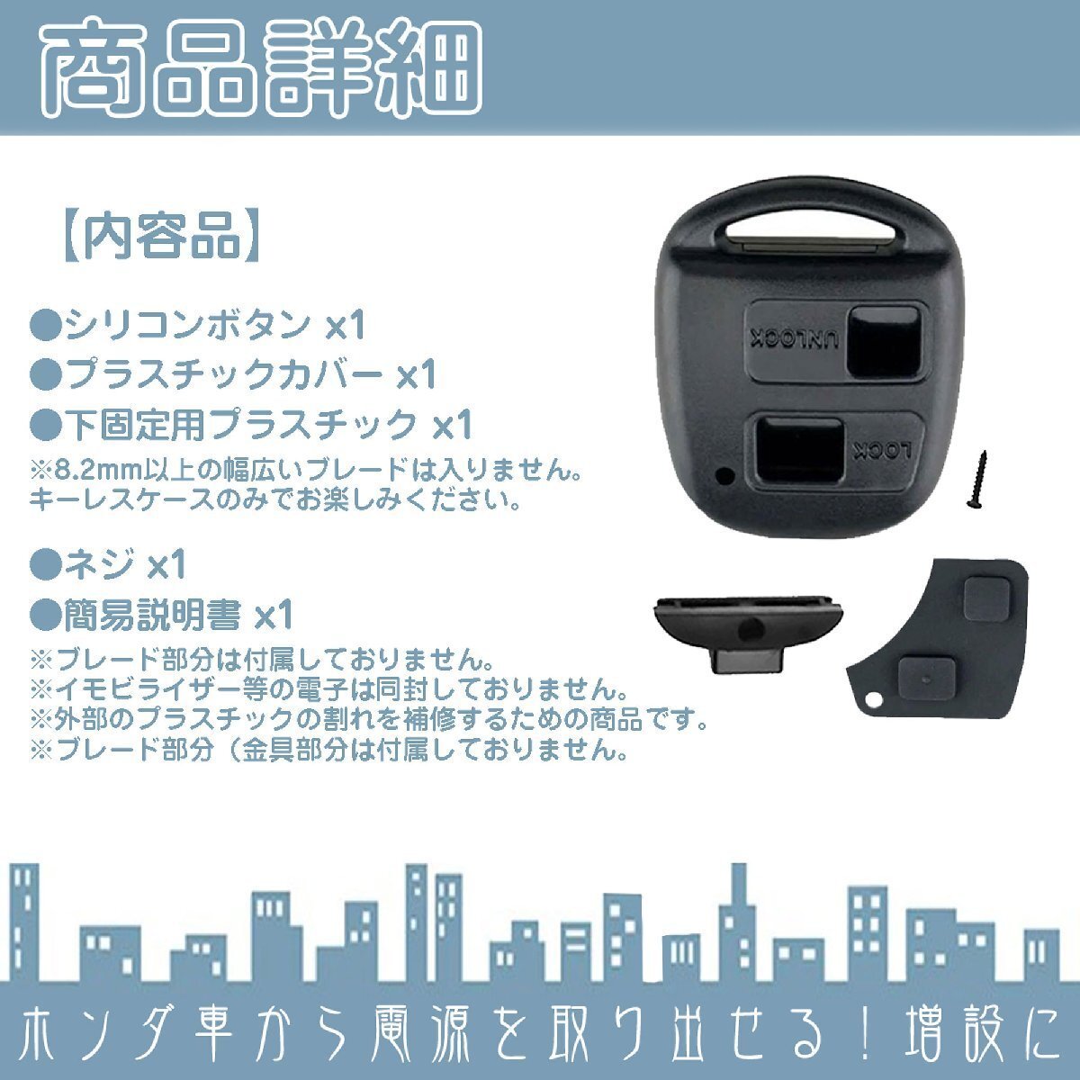 | ・シリコンボタン ・プラスチックカバー ・下固定用プラスチック1個 ・ネジ1個 ・簡易説明書 ※ブレード部分は付属しておりません。 ※イモビライザー等の電子は同封しておりません。 ※外部のプラスチックの割れを補修するための商品です。 ※ブレード部分(金具部分は付属しておりません。 |