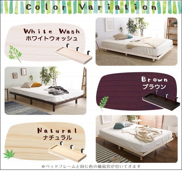 | 【ポイント】 3段階に高さを調節できる脚付きすのこベッド(ダブル)と簡易宮のセットです。 北欧産パインフレームを使用した、通気性と耐久性に優れた頑丈設計。 ナチュラルは無垢材のやさしさ、爽やかなホワイトウォッシュ、シックなブラウンの3色。 簡易宮はベッドフレームに引っ掛けるだけの簡単取付。 スマホなどの小物を置くのに便利なサイズで好きな位置に取り付け可能です。 |