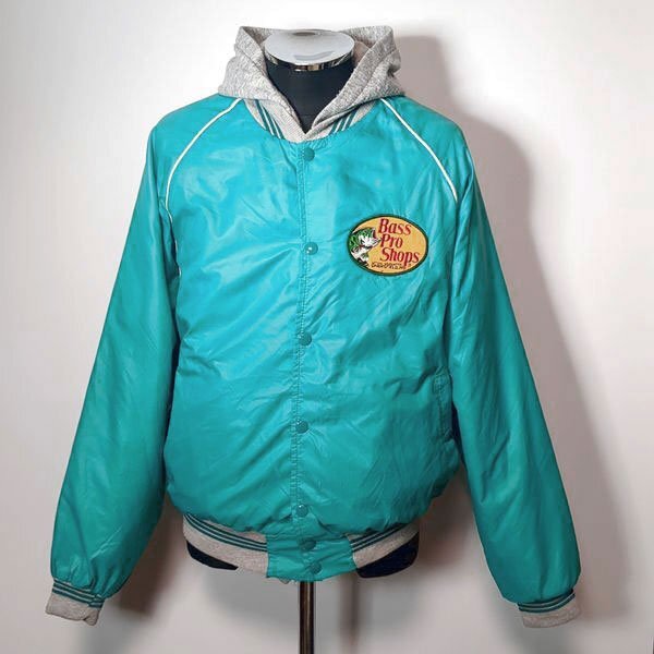【USA製 バスプロショップス スタジャン M ナイロンジャケット ワッペン ブラックバス フード レイヤード Bass Pro Shops ターコイズブルー系 ブルゾン ジャンパー】