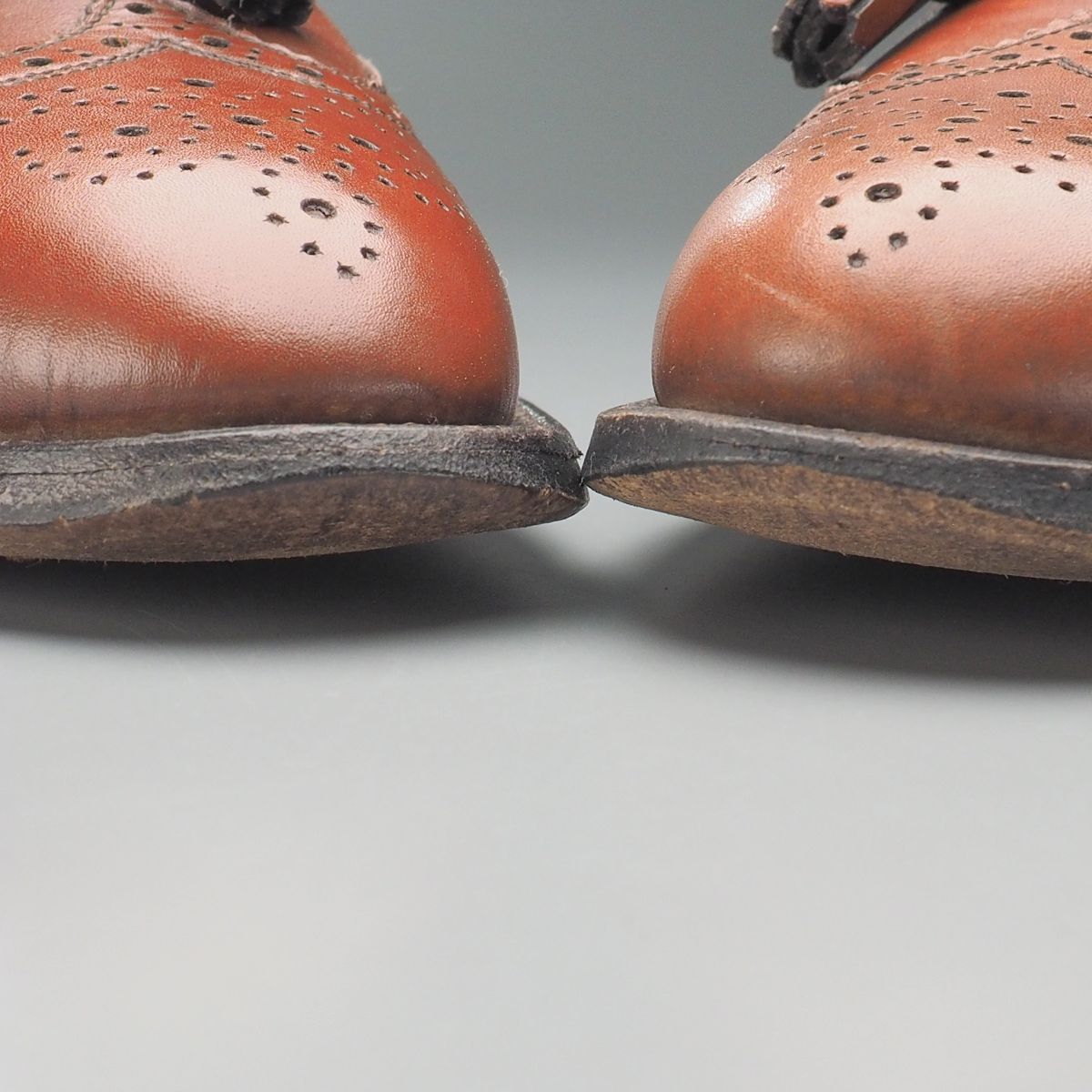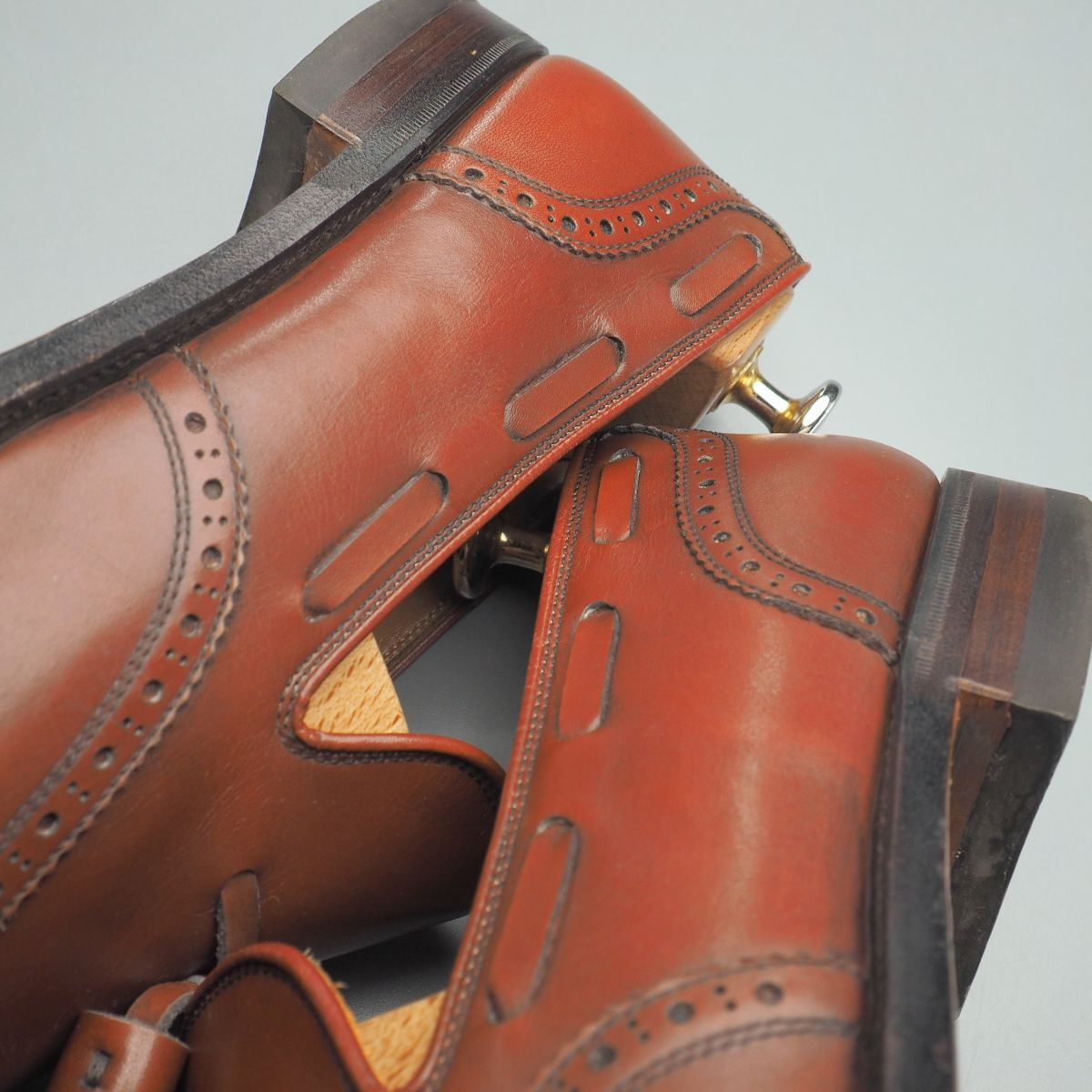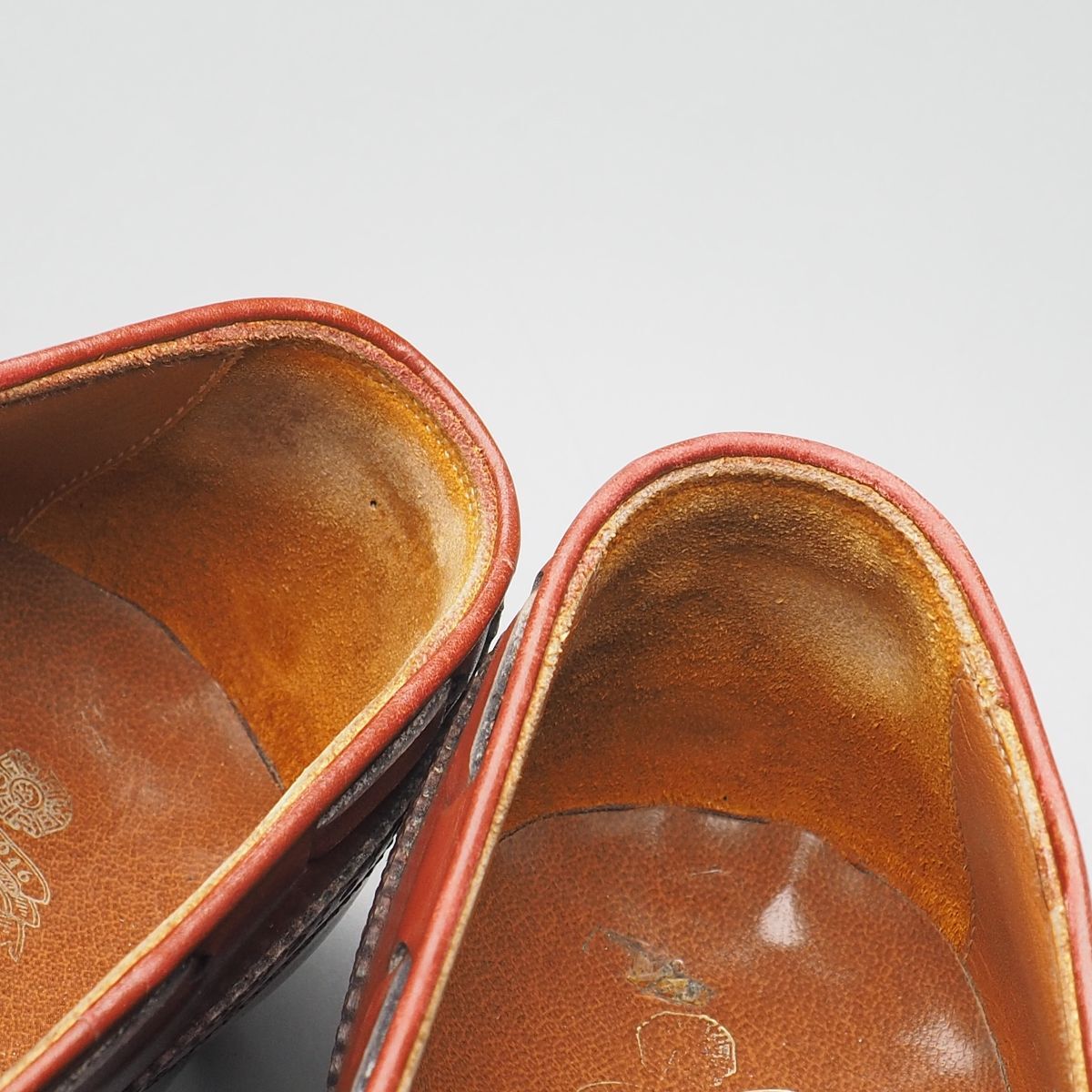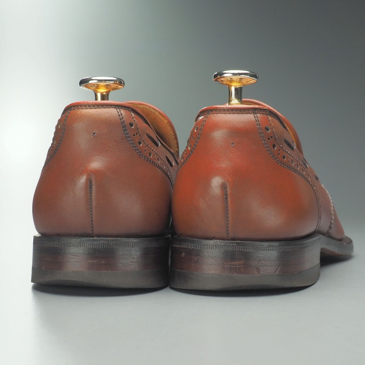 【コンディション詳細】 アッパーのシワ、薄い擦れキズや色ムラ、インソールやライニングの擦れや薄汚れが見られますが、その他気になるようなダメージ等なくこれからも気持ちよくご愛用いただけます。 アウトソールの減りはトゥ・ヒール共に4mm程度、トゥに関しましては減りがウェルト付近に達しておりますので、ご落札後に半張りなどの補強・補修をお勧めいたします。 |