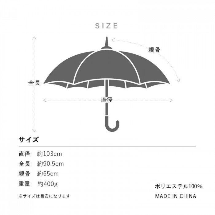 | サイズ | 直径:約103cm、全長:約90.5cm、親骨:65cm 個装サイズ:92.0×5.0×3.5cm |