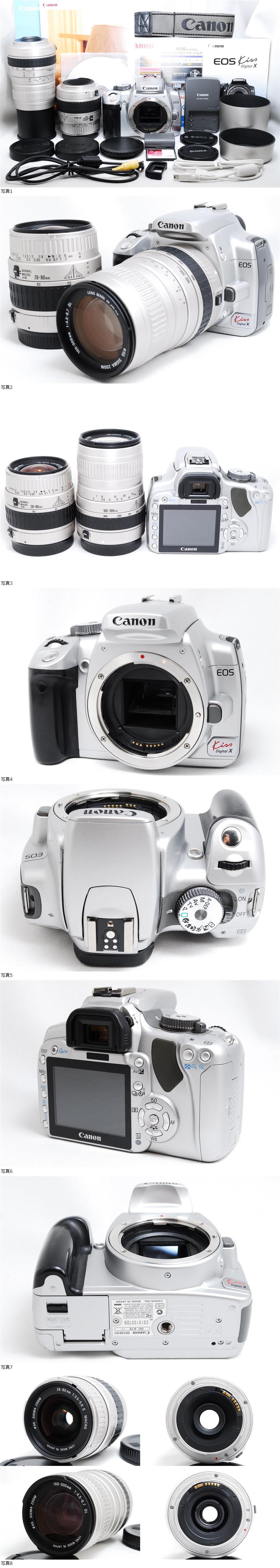 コンディション良好な!! CANON EOS Kiss Xが入荷しました~♪♪ 標準レンズ 28-80mm 、 超望遠レンズ 100-300mm Wレンズセット♪♪ 撮影に必要な バッテリー、充電器、CFカード、説明書、USBケーブル、Solution Disk など付属♪♪ 商品がお手元に届いたら即撮影を楽しむ事が出来ます!! お求めやすい即決価格で出品します!! 1個限定です。お見逃しなく!! ■本機の状態 外観に若干のスレありますが、全体的に綺麗な状態です。 ファインダーは小ごみ、ほこりもほとんどございません。 好調な状態を保っております。 各機能問題なく動作快調です。 ■レンズについて ◆標準レンズ 28-80mm 名門シグマ製で定評のある使いやすいレンズです。 軽くて取り回しが良く、80mm域でマクロ撮影が可能です。 ZOOMがききますので、旅行先や家族写真など 幅広いシーンで活躍すると思います。 ◆超望遠レンズ 100-300mm とても軽量コンパクトな超望遠レンズです。 スポーツ観戦や遠くの景色を撮影するのに重宝します。 レンズに微細なコーティング剥げありますが、撮影に支障ありません。 レンズ内、埃の混入僅かで綺麗な状態です。 実写でも確認いたしましたが、大変綺麗な写真が撮れております。 新品ですと高価なのでお得だと思いますし ZOOMも利くので扱いやすいレンズだと思います。 デジタル一眼レフの入門機として大人気のKiss Digital Xは、 高画質でありながら軽量・コンパクトで持ち運びもらくらく♪ 女性の手にもちょうどよく収まるサイズでとても扱いやすく、 後継機種に比べ、無駄な機能がなくシンプルな作りが今でも愛される 傑作機です!! 操作も簡単でダイヤルをオートモードにしてシャッターを切れば スマホよりワンランク上の綺麗な写真が簡単に撮影できます♪ 最新機種もいいですが、まずは実力派の人気中古で ガンガン使って楽しむのもよいと思います。 格安の中古良品をお探しの方は是非ご検討くださいませ☆ ■付属品 ・ボディ ・ボディキャップ ・アイピースキャップ ・バッテリー ・充電器 ・SIGMA ZOOM 28-80mm F3.5-5.6 ⅡMACRO /レンズキャップ前後+フード ・SIGMA ZOOM 100-300mm F4.5-6.7 DL /レンズキャップ前後+フード ・EOSストラップ ・CD-ROM (Solution Disk) ※データ転送の際に必要 ・Canon My photo life ・Canon iMAGE GATEWAY ・AVケーブル ・USBケーブル ・説明書 ★特典付き★ ・CFカード 1GB ・カメラバック (持ち運びにとても便利です♪) ※万一配送中の破損や、本説明文と著しい相違などがありました際は、 速やかに返品やご返金、または同等品との交換などの対応をさせていただきますので、下記のコメント欄をお目通しいただければと思います。 | |