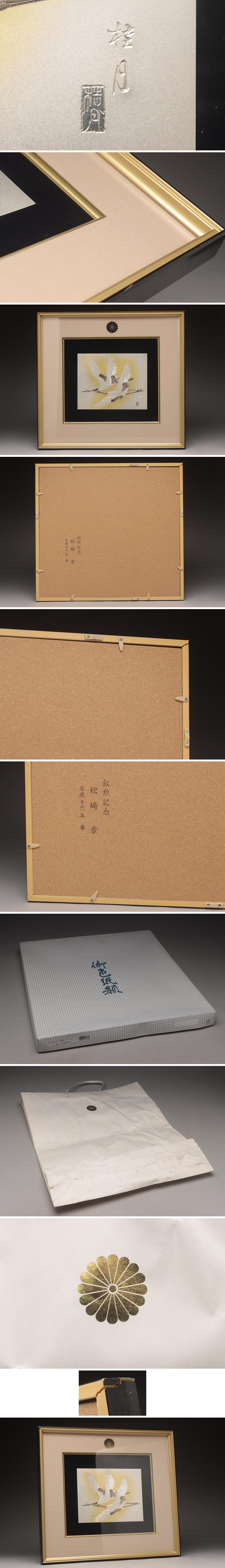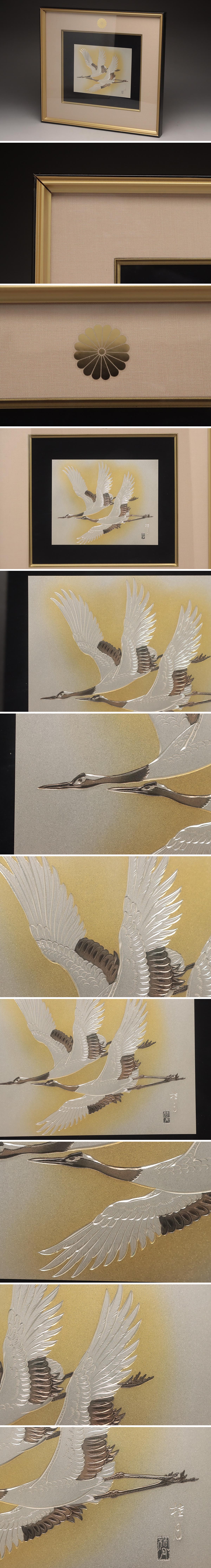 | ◆ 【桂月 作】菊紋章入 金工 銅板 彫金額 片切彫「双鶴図」額装 横41.3cm 縁起物 壁掛 ◆
