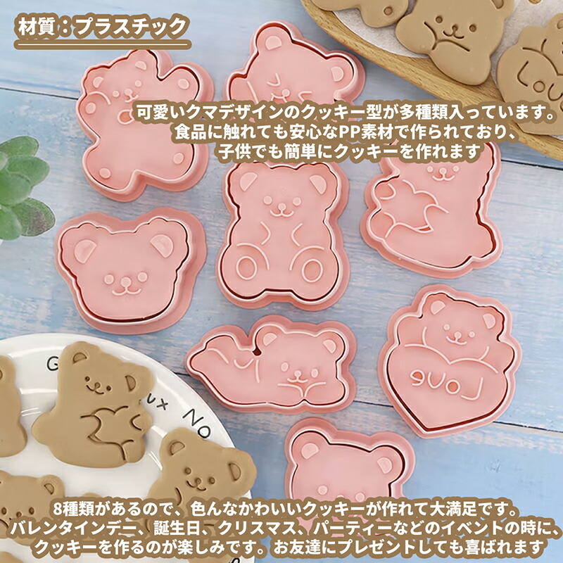 食品に触れても安心なPP素材で作られており、子供でも簡単にクッキーを作れます8種類があるので、色んなかわいいクッキーが作れて大満足です。