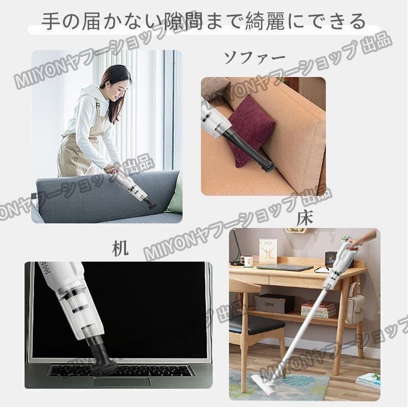 この掃除機には、豊富なアタッチメントが付属しており、床用ノズル、隙間ノズル、ブラシ付きノズル、延長パイプ、ソファ用ノズルなど、様々な清掃シーンに対応します。90°から180°まで調整可能な清掃角度により、あらゆる場所の清掃が簡単です。また、スティッククリーナーとしてもハンディクリーナーとしても使用可能な4WAY仕様で、使用場所に応じて最適な使い方が選べます。家庭やオフィス、車内など、どんな場所でも快適に使えるデザインで、清掃作業を楽に行えるのが特徴です。これらの多機能アタッチメントを使って、隅々まできれいにしましょう。