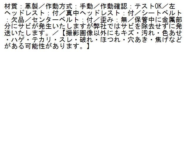 | 商品情報 | 材質:革製/作動方式:手動/作動確認:テストOK/左ヘッドレスト:付/真中ヘッドレスト:付/シートベルト:欠品/センターベルト:付/歪み:無/保管中に金属部分にサビが発生いたしますが弊社ではサビを除去せずに発送いたします。/【撮影画像以外にもキズ・汚れ・色あせ・ハゲ・テカリ・スレ・破れ・ほつれ・穴あき・焦げなどがある可能性があります。】 | ||