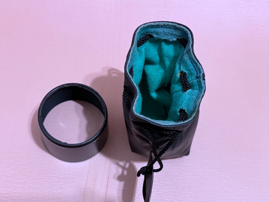 フードには珍しい**巾着袋(ポーチ)**が付属しており、フード単体での持ち運びや保管に非常に便利です。巾着袋の内側はターコイズブルーの柔らかな起毛素材で、フードを傷から守ります。