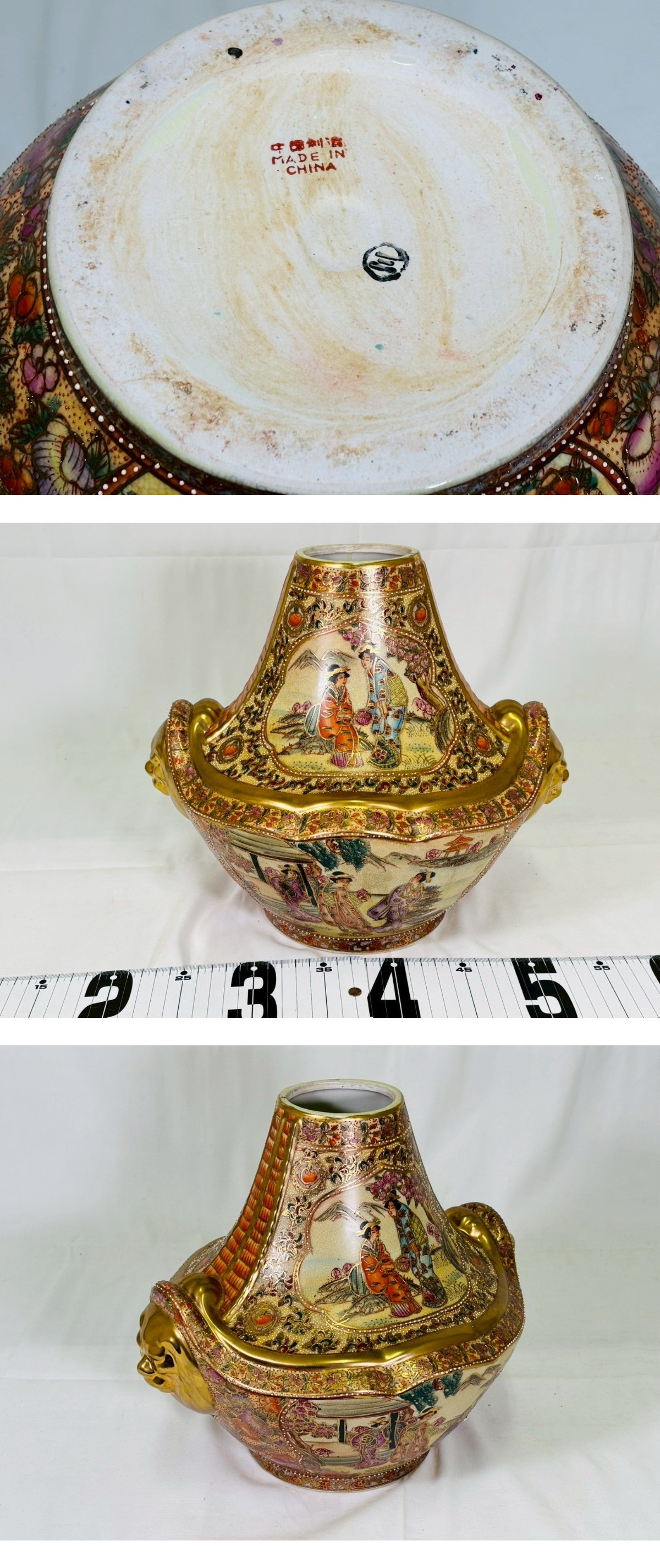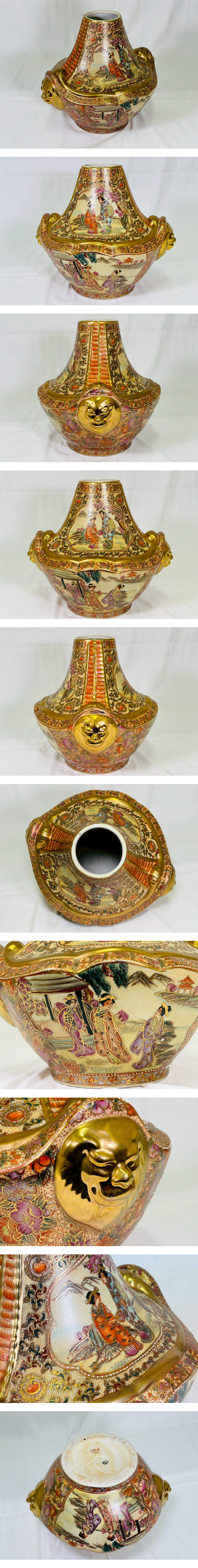 ●【豪華】金彩 盛上 獅子耳 飾壷 薩摩 美人図 風景図 飾瓶 特大 存在感 飾物 中国美術 骨董 古美術 インテリア オブジェ 時代物 ■サイズ:横幅 34cm/縦幅 29.5cm/高さ 30cm ※素人寸法の為、若干の誤差はご了承ください。 ■状態につきましては経年に伴うスレ・汚れ・小キズ などが見られます。 ※その他の細かな状態は写真にてご確認・ご了承の上 ご入札くださいませ。 ●こちらの商品などは時代物や古いお品・骨董品となり ますので、細かな状態を気にされる方・神経質な方の ご入札はご遠慮くださいませ。【ZI】 |