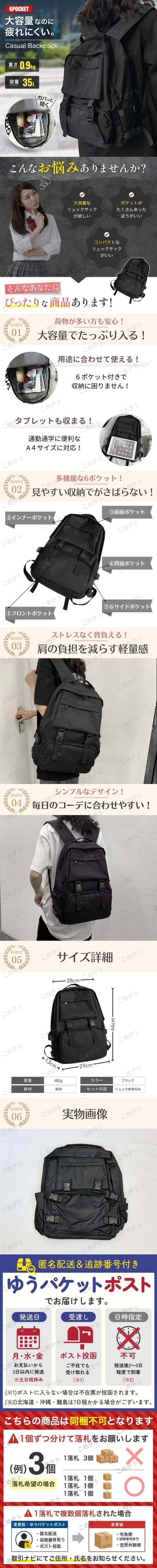 【商品説明】 ■軽量なのにしっかり大容量! シンプルなデザインと定番のブラックカラーのリュックサックです。 ■たっぷり入る驚きの大容量! ノートパソコンやA4ファイルもすっぽり収納できるので、通勤通学に活躍します。 ■多機能に収納ができる6ポケット付き! 化粧品や長財布、500mlペットボトルも問題なく収納できます! たくさん収納があるため、妊婦の方のマザーズバッグとしてもおすすめです。 ■ストレスフリーな軽量感! 重量わずか600gと軽いので、肩の負担を軽減します。 ■毎日のコーデに悩まないシンプルなデザイン! シンプルな装いなので、どんな洋服も引き立てるバッグです。 メンズ・レディース・キッズ問わずお使いいただけます。 ■さまざまな場面で活躍! ・学生のスクールバッグ ・社会人のビジネスバッグ ・妊婦さんのマザーズバック ・旅行用のトラベルバッグ ・防災グッズを入れる防災バッグ 【商品詳細】 ■サイズ:44cm×29cm×13cm ■カラー:ブラック 黒 ■重量:600g ■素材:帆布 キャンバス生地 【お支払い方法】 ・!かんたん決済 【発送について】 ・おてがる配送(日本郵便)で発送します 発送日 :お支払い後1~3日以内 到着目安:発送後2~5日程度 ※遠方の方はもう少しかかる場合もございます ◎注意事項 ・落札後は期限内にお支払いください ・商品画像の転載や説明文のコピーはお止め下さい ◎初期不良は対応しますので、何かあれば「評価前に」ご連絡下さい |