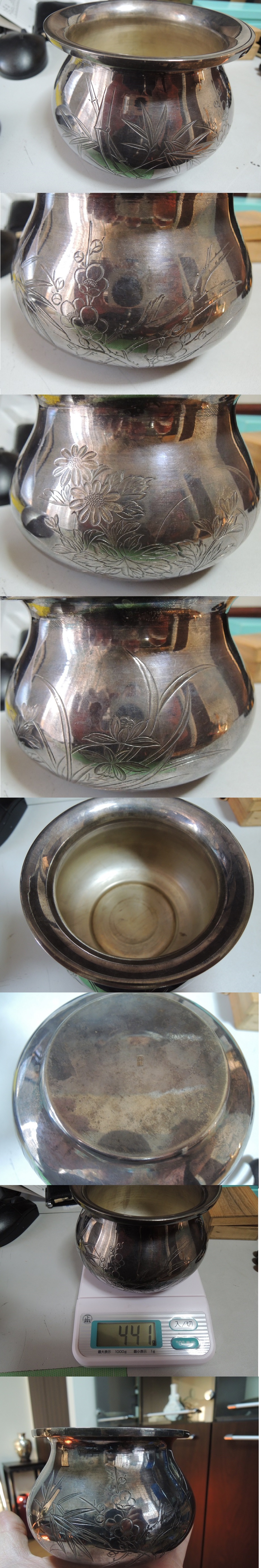 梅蘭竹菊四君子 純銀 香炉 本物保証 純銀印があり