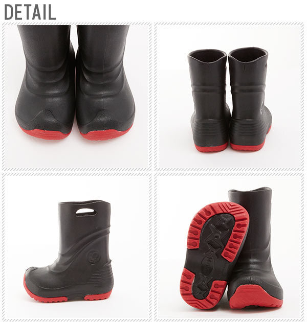 | 商品説明 | 軽くて丈夫なEVAキッズレインブーツです。重さは一般ゴム長靴の半分以下! 靴裏にすべり防止のゴムソールを使用していて、滑りにくいので、安心ですね。 完全防水なのも嬉しいポイント♪ |