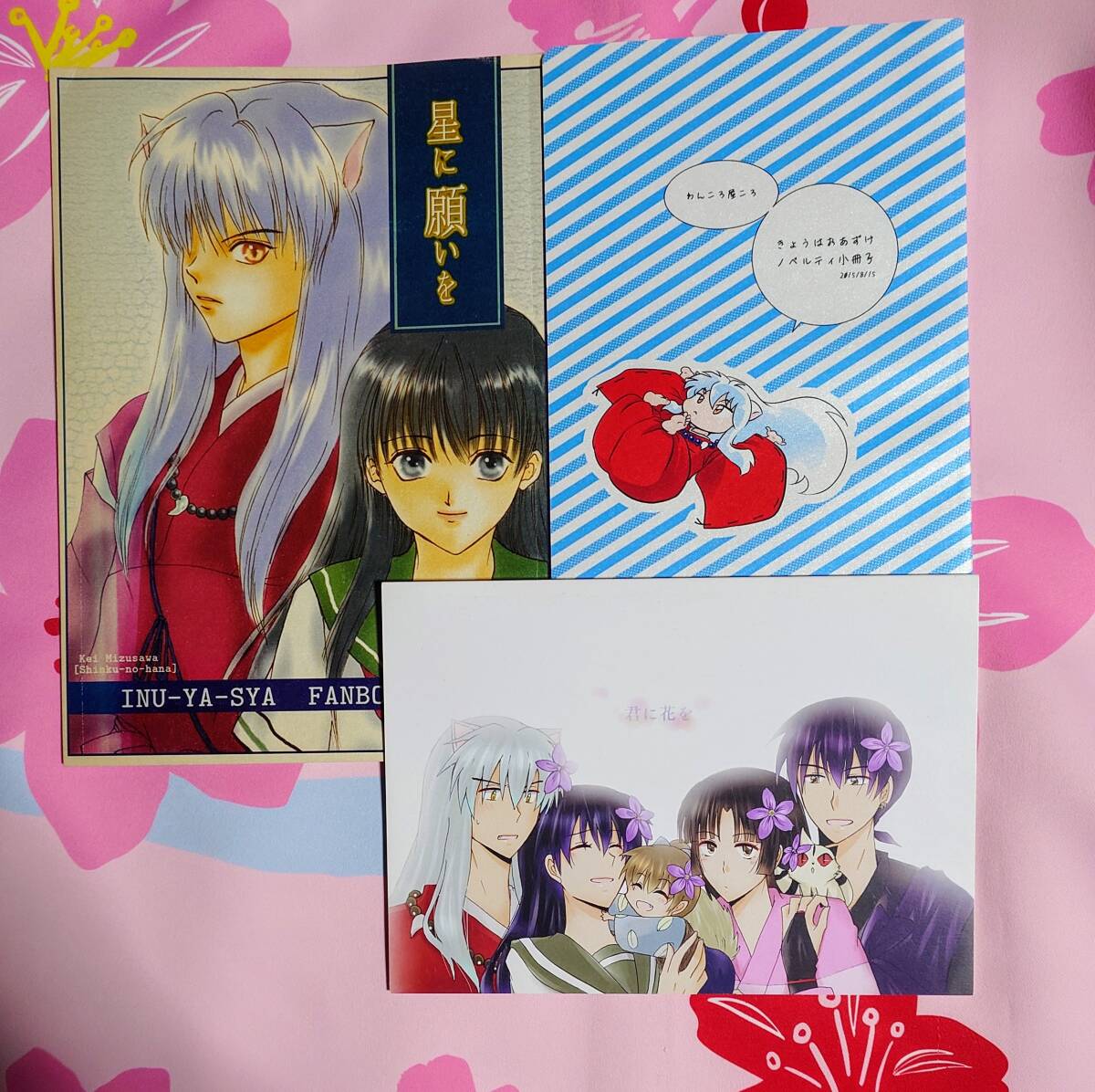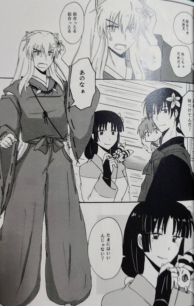 【3冊セット】(バラ売り不可) ①「星に願いを」B5・44ページ(2001.7.20)深紅の華/画:水沢珪/★真夜中に突然、かごめに連れ出された犬夜叉。犬夜叉に全く警戒心を持たないかごめに、犬夜叉は異性として意識されてないようで、些か落ち込む。だが、かごめが犬夜叉を誘った理由は…。ゲスト小説あり。②君に花を」A5・28ページ(2017.1.8)いぬちゃ。/画:咲綺/★旅の途中での、犬夜叉一行の心和むひと時。 ③「きょうはおあずけ」A5・12ページ(2015.8.15)わんころ屋/画:ころ/ノベルティ小冊子です。★妖力を奪われ、一時的に小さくなってしまった犬夜叉。その可愛さに萌えるかごめと珊瑚。そこへ殺生丸が現れる。☆カバーをかけて保存していますので比較的きれいな状態ですが、人手に渡った品である事をご了承下さい。ノークレーム、ノーリターンでお願いします。発送は、ゆうメール230円か定形外320円またはレターパックライト430円を予定しています。同梱発送も承ります。